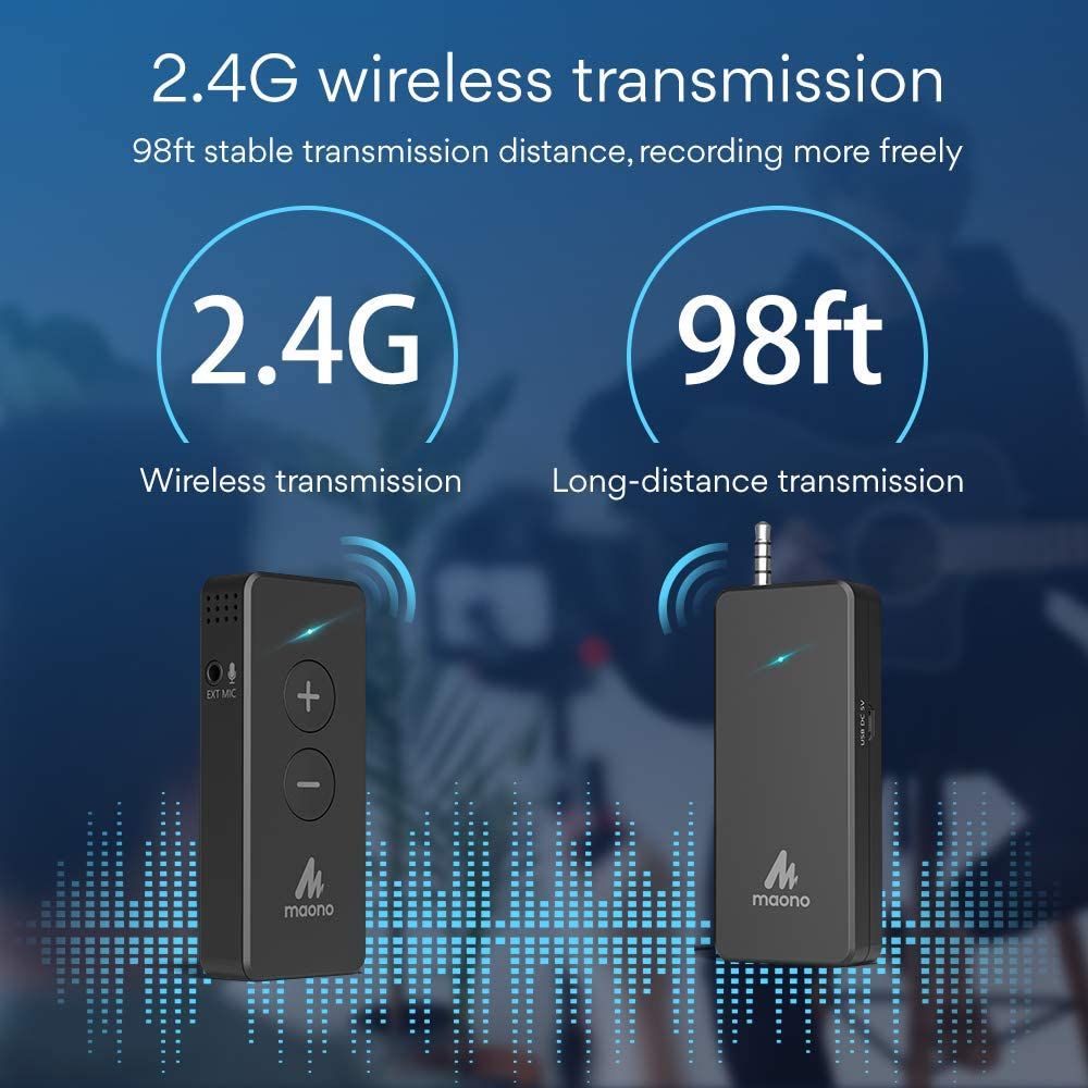 - 2.4G Hz digital wireless transmission technology: Plug and play, turning on the receiver and transmitter at the same time, they will pair automatically in 2 seconds. 2.4G wireless microphones come with better stability, better data transmission for clear sound. Up to 100ft(30m) communication range.