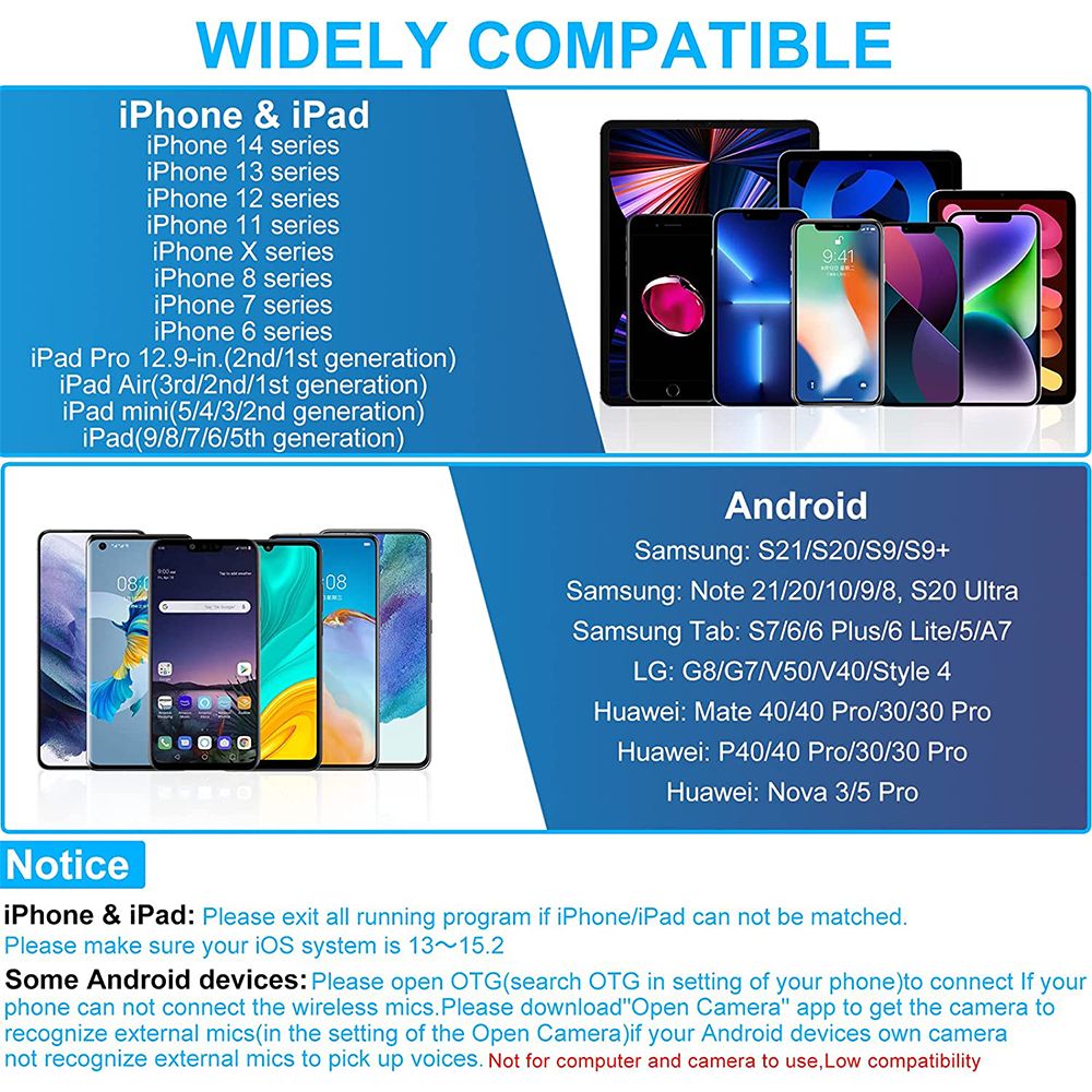 Compatible with all Android systems (Samsung series mobile phone models do not support original camera recording, and need to be recorded via APP camera). Microphone is suitable for video broadcasting, recording, conference, YouTube, Facebook live, Vlog, Tik tok, Twitc, etc.