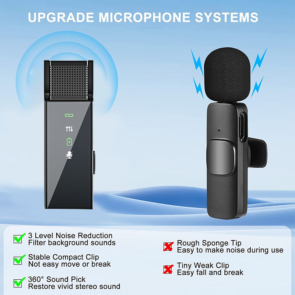 Upgraded Wireless Microphones 2 Pack: this small lapel clip microphone come with 2 transmitter, 1 receiver, which can help you easily to close recording 2 sound source at the same time without interference, great for interview, face to face talking podcasting living streaming. No need Bluetooth, plug & Play, quick set up, real hands-free shirt clip mic