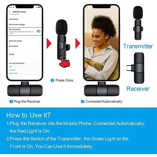 - 5.) How to use: Plug the connector into your phone and see the red indicator light flash. Then, just press the power button once to turn on the microphone and it will start flashing green and red, allowing the microphone to automatically connect to the connector. Then, the indicator lights on the microphone and connector will stop flashing, indicating that the connection is successful and can now be used to record videos and vlogs.