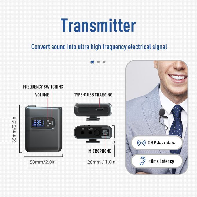 Transmitter is built in microphone, equipped with lavalier microphone, convenient to use. The transmitter can adjust the volume and frequency.