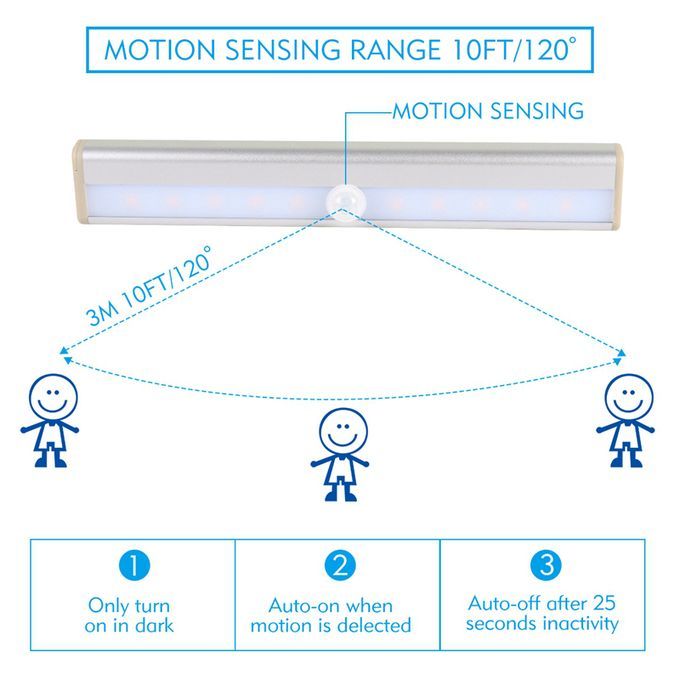 1.WORKS IN THE DARK - Has Daylight and Motion SensorsTurns on in the dark when motion is detectedDoes not turn on in the daylight to save battery life2.Turn on only when motion is detected in the dark within 10 Ft,and turn off 15-1 8 seconds after the person walks away3. No GlareNo FlickerNot DazzlingBlu-ray Reduction
