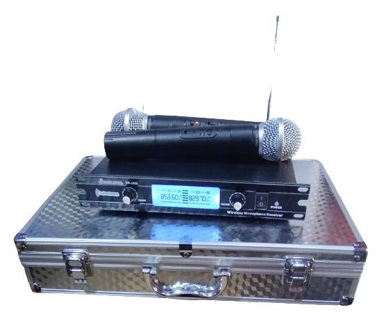 The Dr3000 wireless microphone system s a wireless microphone with VHF frequency and distance range of 100 meters foot range. Ideal for Teaching, Preaching, Musical concerts and other programs. Supplied with a reciever, two wireless microphones, two batteries and cable.The Dr300wireless microphone system is a wireless microphone with VHF frequency and distance range of 100 meters foot range. Ideal for Teaching, Preaching, Musical concerts and other programs. Supplied with a reciever, two wireless microphones, two 9V batteries and cable.