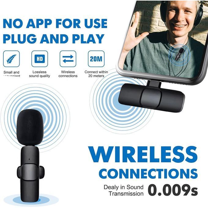 Package included: 1 x Rechargeable Wireless Microphone 1 x Receiver 1 x iPhone Lightening Adapter 1 x usb c cable