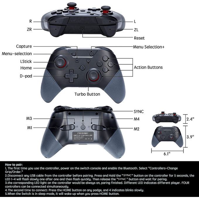 High compatibility Replacement Nintendo Switch Controller: switch controllers are perfectly nintendo switch accessories compatible with all Nintendo Switch / Switch Lite console. Such as The Legend of Zelda, Splatoon 2, Mario Kart 8 Deluxe, Super Mario Odyssey, Pokemon S-word & Shield ect. Perfect extra switch pro controller for you!Enhanced functions: This switch pro controller for nintendo have key mapping function enable you to map joysticks , what's more, wakeup function, turbo function, gyro axis motion function, dual motors vibration function, screen short-cut function etc will fullfill your playing your experience. the switch controllers dural vibration feedback gives you a pefecetly gaming experience, 6-axis gyro and trigger to detect subtle movements rapidly provides you exactly precise movement control.Extend play time: This switch turbo controller has ergonomic design and light weight so it is comfortable even for long hours of continuous gaming. 500MAH built-in rechargable battery, which can be continuously used for around 8-10h after fully charged(2-3hour charging time). No need to replace the batteries. the Wireless Switch Controller is your best alternative switch controller for Nintendo Switch video games.Bluetooth 5.0 connection: the wireless controller for switch features with bluetooth V5.0 and strong anti-interference technology, paired quickly, stable up to 10M distance (barrier-free environment).After the first time pairing with the switch, you could simply press the HOME button on the switch controller to wake up both the controller and the switch game console.Life-time technic service: switch pro controllers will automatically switch to sleep mode after 5 minutes without operation. DOESN'T support Amiibo function. PROVIDED lifetime technical support. Please feel free to contact us for help.