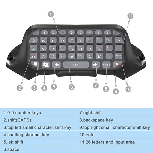 1,Compatible for Xbox 360 controller2,Keyboard for easy text input and chat with friends after connect the keyboard to Xbox 360 controller3,Easy to use, plug in and play;Full QWERTY keyboard for easy text input4,Working Voltage:DC 3-3.3V Working Current:0.25-2mA5,Material:High quality ABS6,Packing Included:1* keybaord 1* user manual