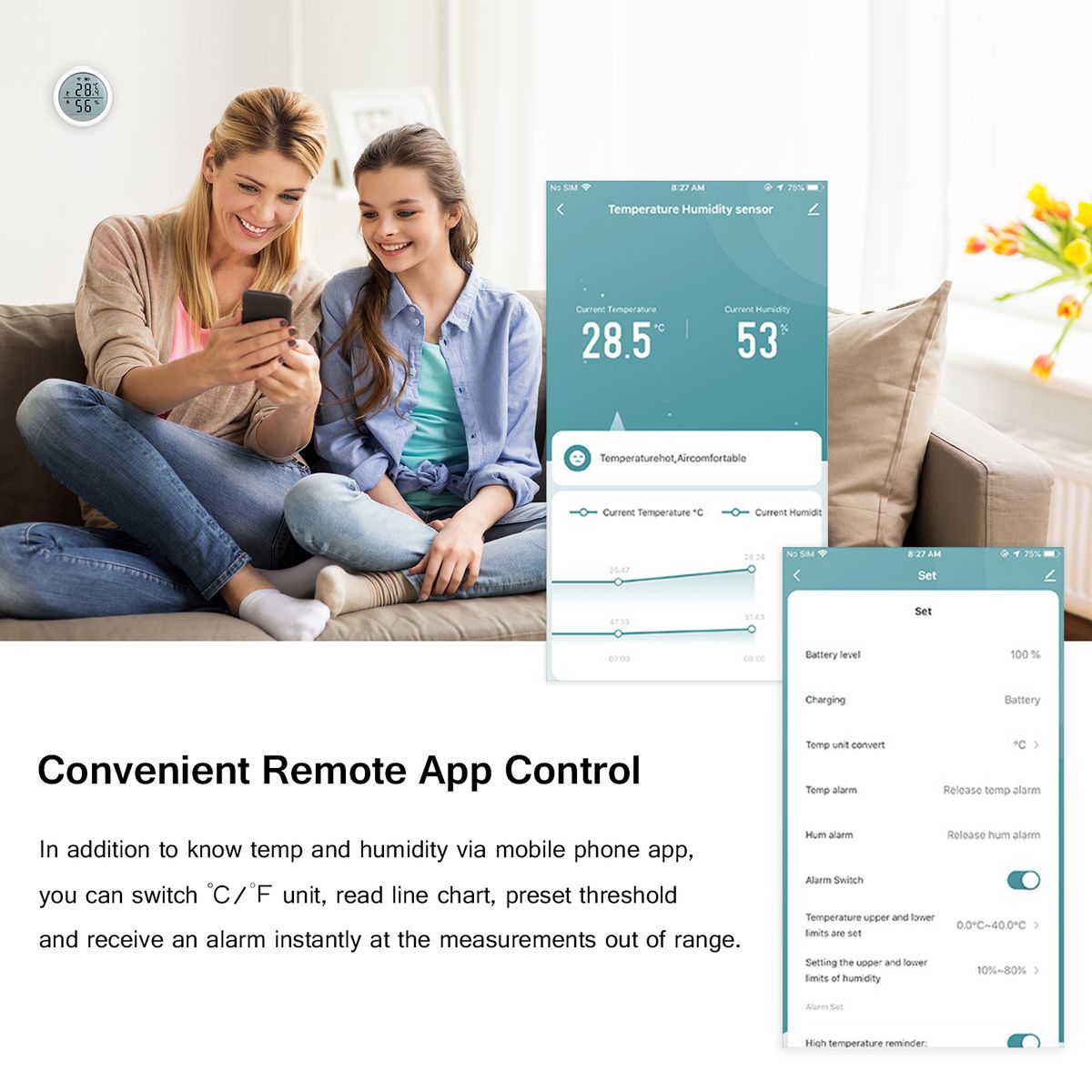 Convenient Alert Function: in addition to switch unit (℃/℉), read line chart, you can preset temp amp; humidity threshold with app, receive an alarm immediately at the measurements out of range.