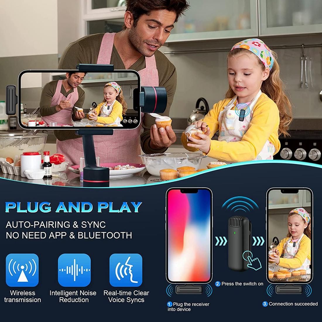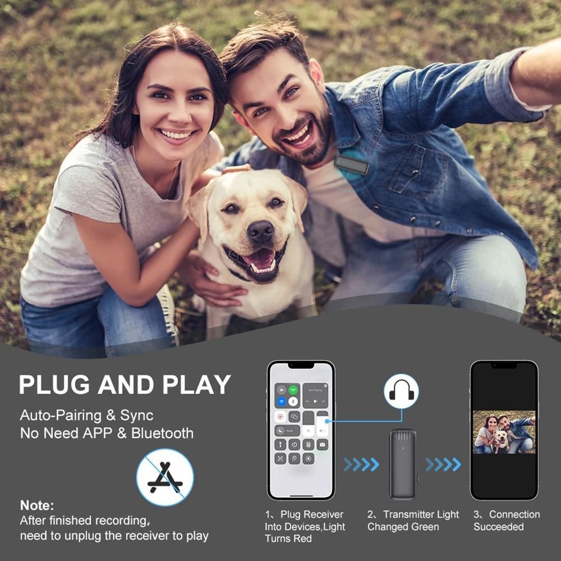 [Easy to Use and Lightweight]Wireless microphone without connecting to bluetooth and apps. Simply plug the receiver directly into the port of your iOS device and it will automatically connect. The comfortable microphone is no burden, so you can get rid of the shackles of cables and easily realize video recording.