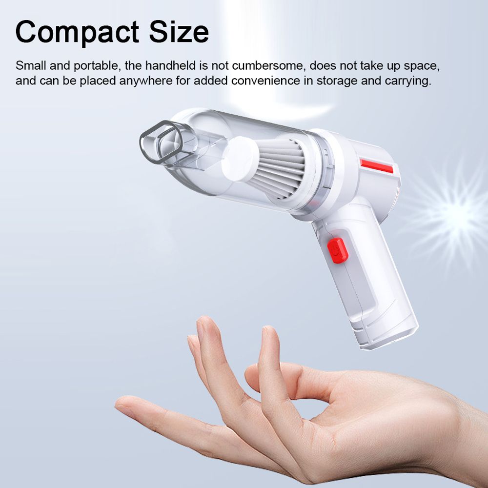 This wireless vacuum cleaner is compact with a large suction power of 5,000Pa for easy handling in cars, homes, offices, cavity corners. Powerful all copper coil motor, brings surge power, suction power without heat for long duration, effective and fast, sucking out stubborn dust. Customized with multiple accessories to address cleaning issues, efficient vacuum experience, and multi-scene testing. Visualized transparent dustbin, easy to empty with a easy adjustment. Equipped with a washable filter, it is washable and repeatable for longer use.