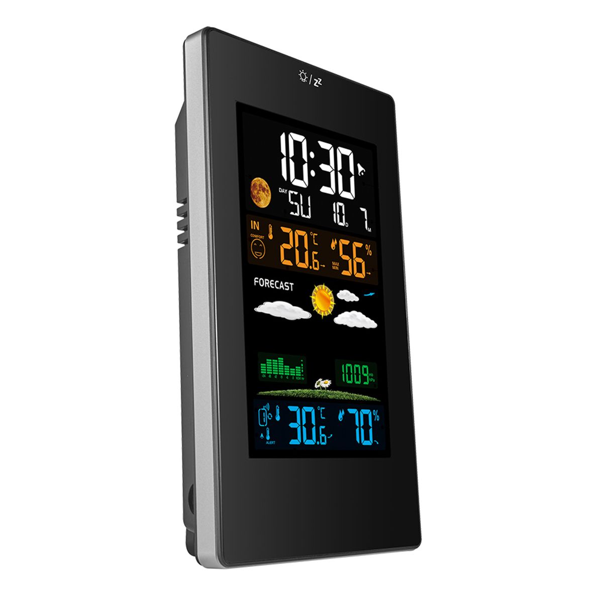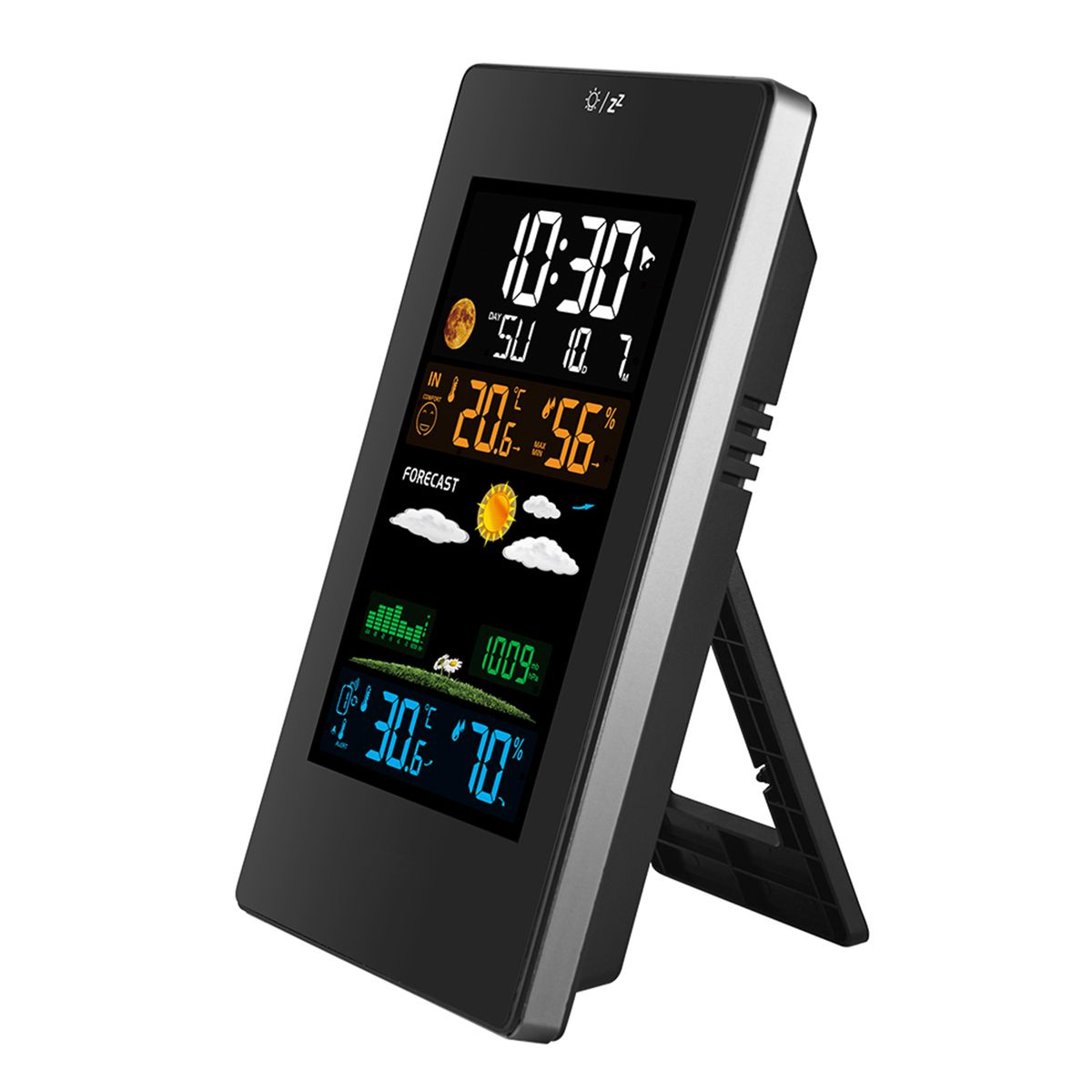 Versatile Weather Station -- 4 level backlight LCD screen to display more information that you demands: Indoor/outdoor temperature and humidity(max/min), customize temperature and humidity (hi/lo) alerts, time/date(7 language), alarm clock/snooze(extra 5-minute sleep), vivid weather forecast, moon phases, barometric pressure trend and 5 comfort level.