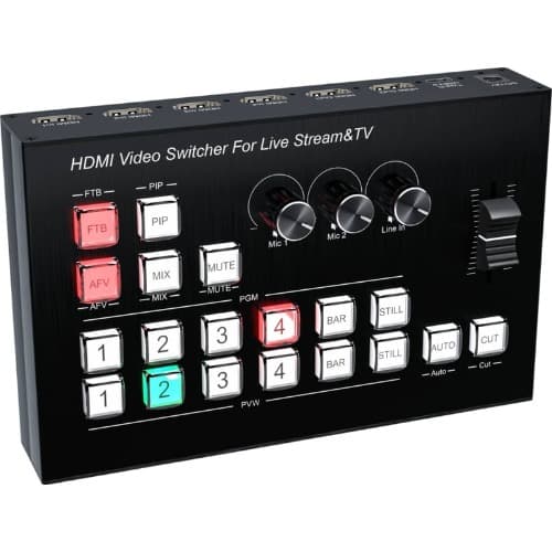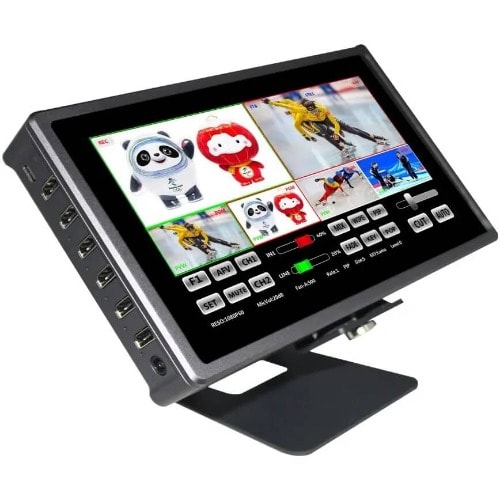hdmi *4 in; 1 hdmi pgm & 1 multiview out; 7" touch screen; lock screen; t-bar; type-c stream; luma/chroma; rtmp stream, record; sd/hd/3g, up to 1080p60, backword compatible; input resolution adaptive, pgm output selectable; auto/cut transitions,mix/ fade/wipe effects; pip, still, mute, ftb, color bar; 2-ch mic in, 1-ch line in, 1-ch line out; afv, mix, dcb, tally... does not include stand tripod!