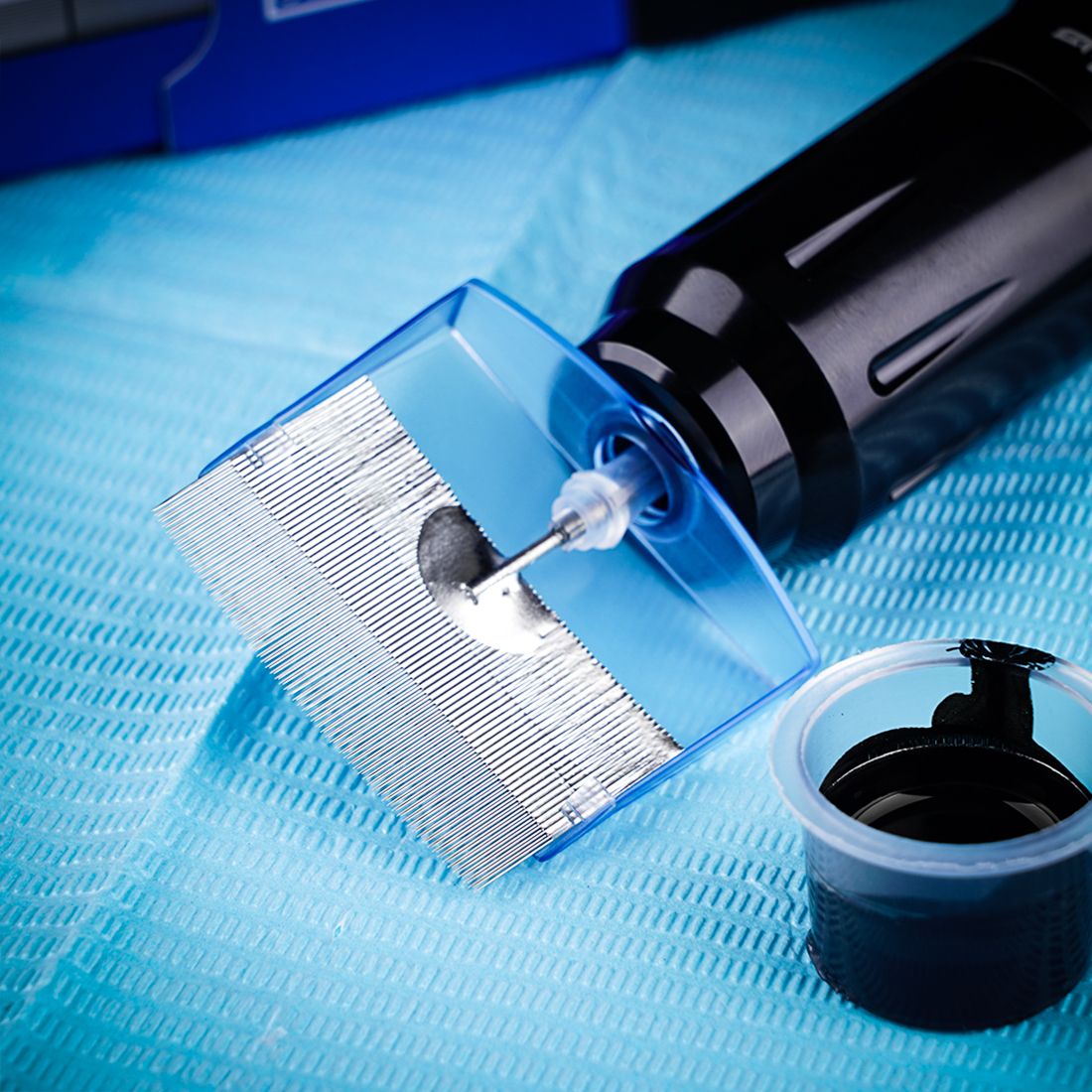 There are four special elastics hold on a rebound that lighten the pressure of the needle bar, working silence. The frame is made of PC polycarbonate, Polycarbonate is colorless, transparent, heat resistant, impact resistant, flame retardant, BI grade, and has good mechanical properties at normal use temperatures. From the outer needle shell to the needle thread, and even every part, we have carried out layer screening and testing to make a needle run smoothly, save more ink, fast color, low skin loss, and every detail is critical. The needles wire is fixed by fogging and discharging needles, plastic sets, and precise models, which greatly reduces the welding process, thus avoiding the chemical pickling process and ensuring the safety and hygiene of each needle wire. The design of the ink guide groove is added under the needles nozzle to increase ink storage. The protruding part becomes the track when the needles are out. With the arc clamp limiter on both sides of the needles nozzle, the friction coefficient is reduced, the stability of the needle is increased and the smooth needle and ink flow are guaranteed. The design of secant needle is similar to each other. The stabilizing device of cross needle can make the needles run steadily and increase the ink storage at the same time. The radian of the front section of the arc-shaped needle nozzle is the same as that of the needle wire. Grinding design of the front end of the needle nozzle to increase ink storage and control color spillover.