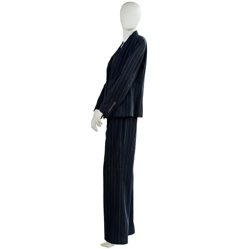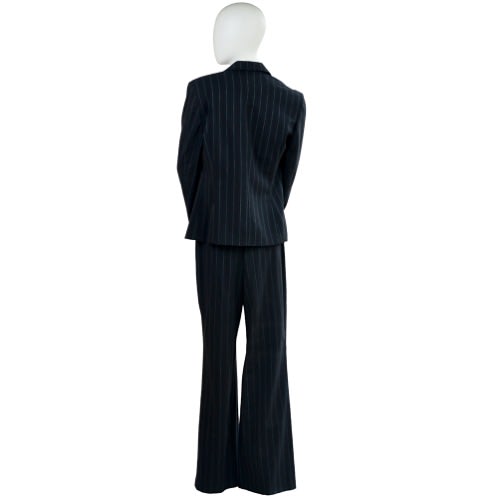 Fully lined blazer and features a notched collar, matching belted waist, panel structure, and long sleeves with front button closure. The matching pants feature structured waist inset pockets, hook-and-bar and zipper closure, slashes hip pockets, and belt loops.