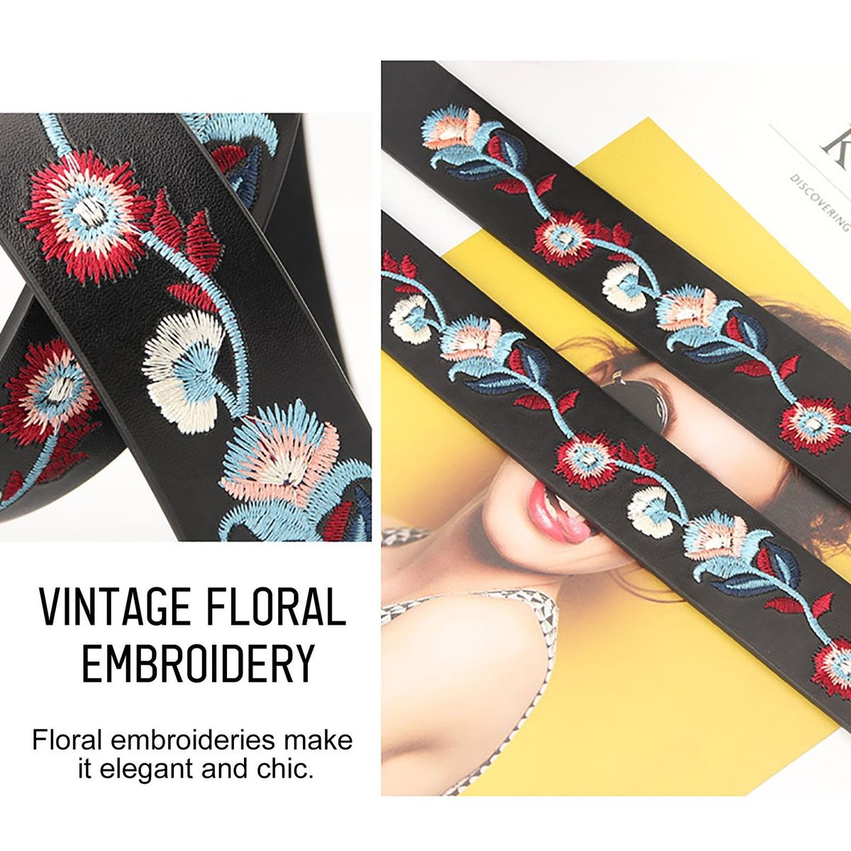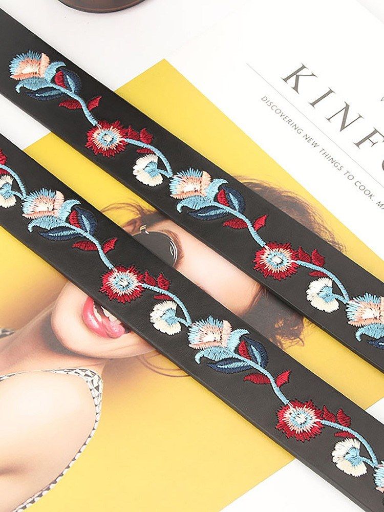 39.4 quot;X1.3 quot; or 43.3 quot;X1.3 quot; belt with vintage floral embroideries and D-ring buckle is chic and elegant.