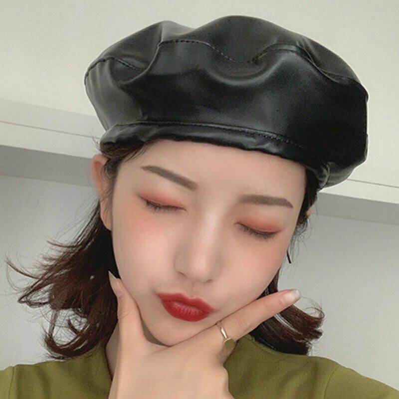 PU Leather Women Beret Hat Fashion Street Artist Warm Beanie Cap Autumn Winter Retro Solid Color Black Beret