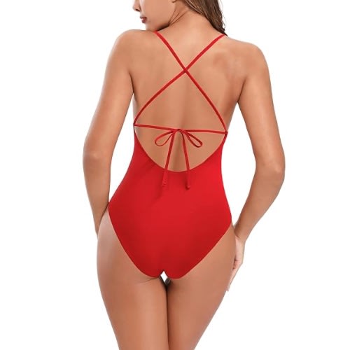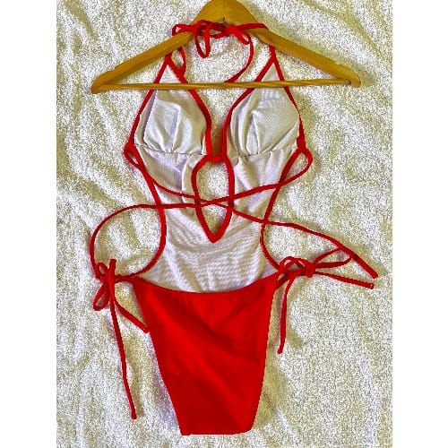 - V-neck; knot detail and keyhole at center front; knot details at straps and back.