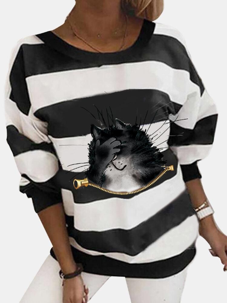 Buy Women Cartoon Cat Horizontal Stripe Print Casual Long Sleeve Sweatshirts in Nigeria