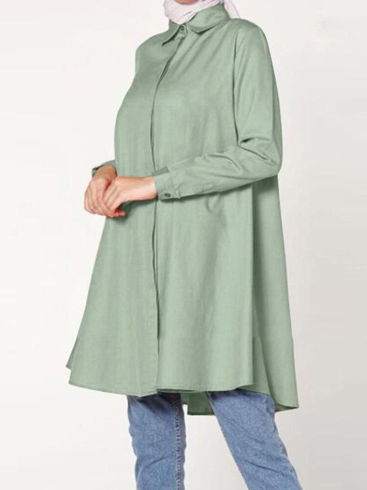 Buy Women Casual Solid Color Lapel Long Sleeve Longline Loose MuslimBlouse in Nigeria