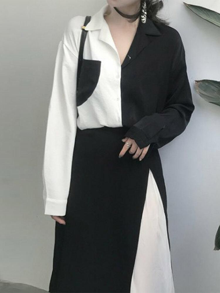 Buy Women Contrast Color Patchwork Two Tone OL Business Lapel Long Sleeve Shirts With Pocket in Nigeria