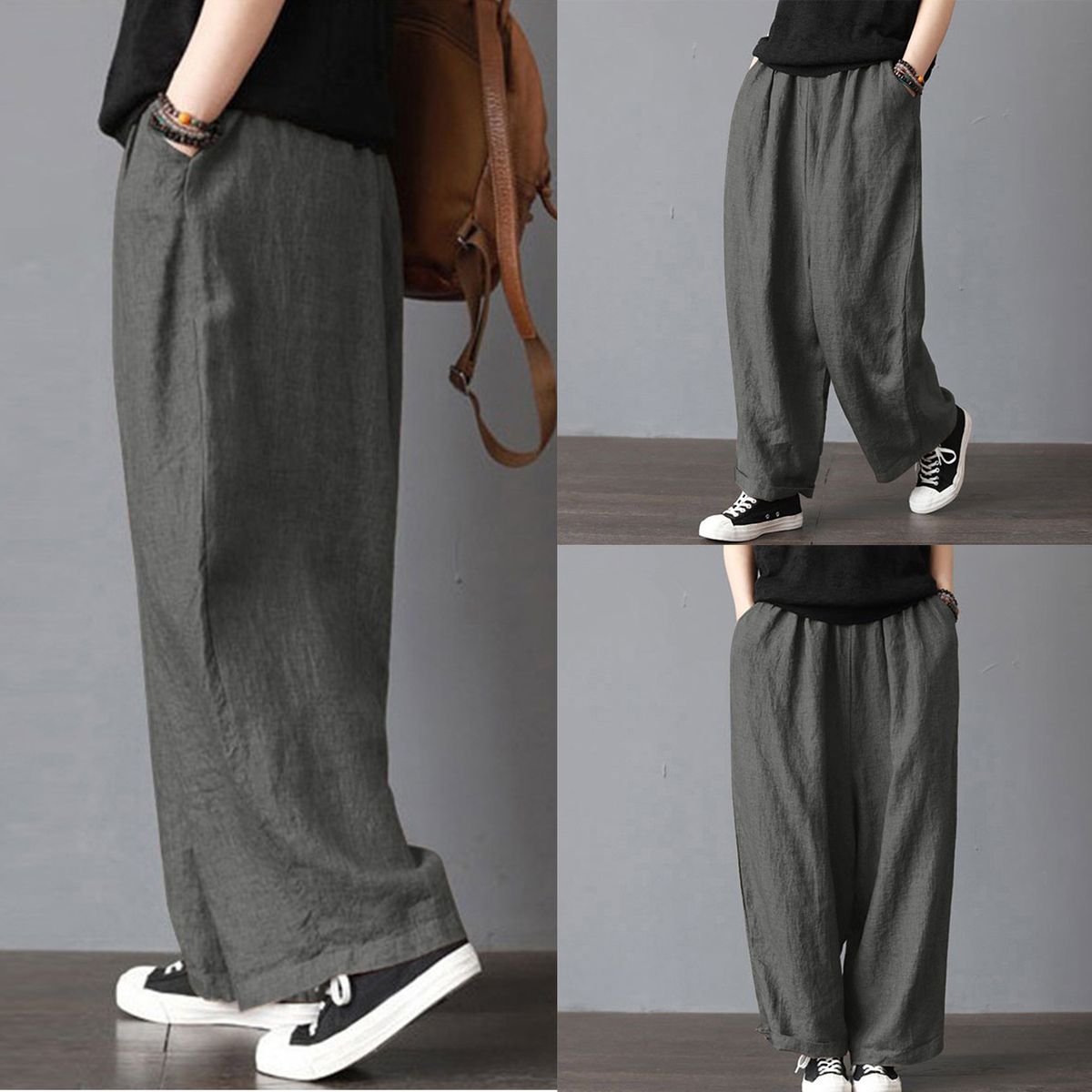 Buy Women Cotton Linen Wide Leg Pants Elastic Waist Pockets Comfy Solid Loose Casual Trousers-grey in Nigeria