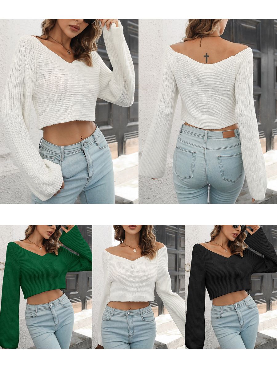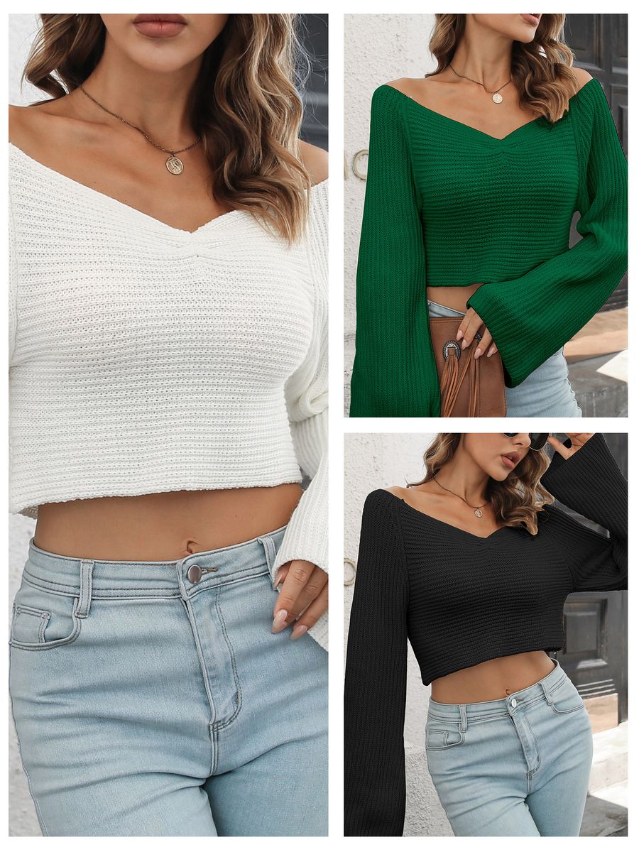 V-neck, long sleeves and belled cuff.