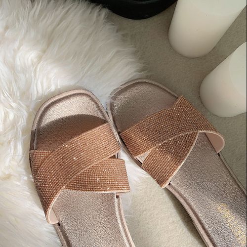Product Category: Casual SandalsApplicable age: adultUpper material: PVCSole Material: RubberStyle: European and AmericanToe shape: round headPopular elements: rhinestones, sequinsWearing style: sleeve / shoe coversFunction: breathable, waterproof, balanced, non-slippattern: plainUnique process: injection shoesColor: goldenSizes: 38, 39, 40, 41, 42Heel shape: flat bottomHeel height: low heel (1-3CM)