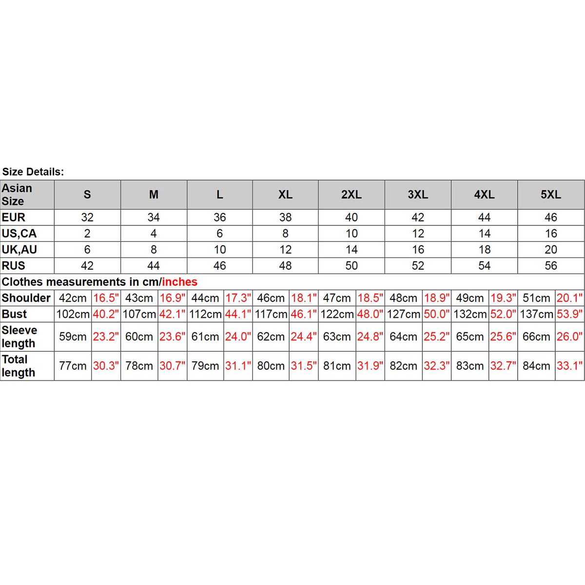 Size: S (US2 UK/AU6 EU32) / M (US4 UK/AU8 EU34) / L (US6 UK/AU10 EU36) / XL (US8 UK/AU12 EU38) / 2XL (US10 UK/AU14 EU40) / 3XL (US12 UK/AU16 EU42) / 4XL (US14 UK/AU18 EU44) / 5XL (US16 UK/AU20 EU46) (optional)