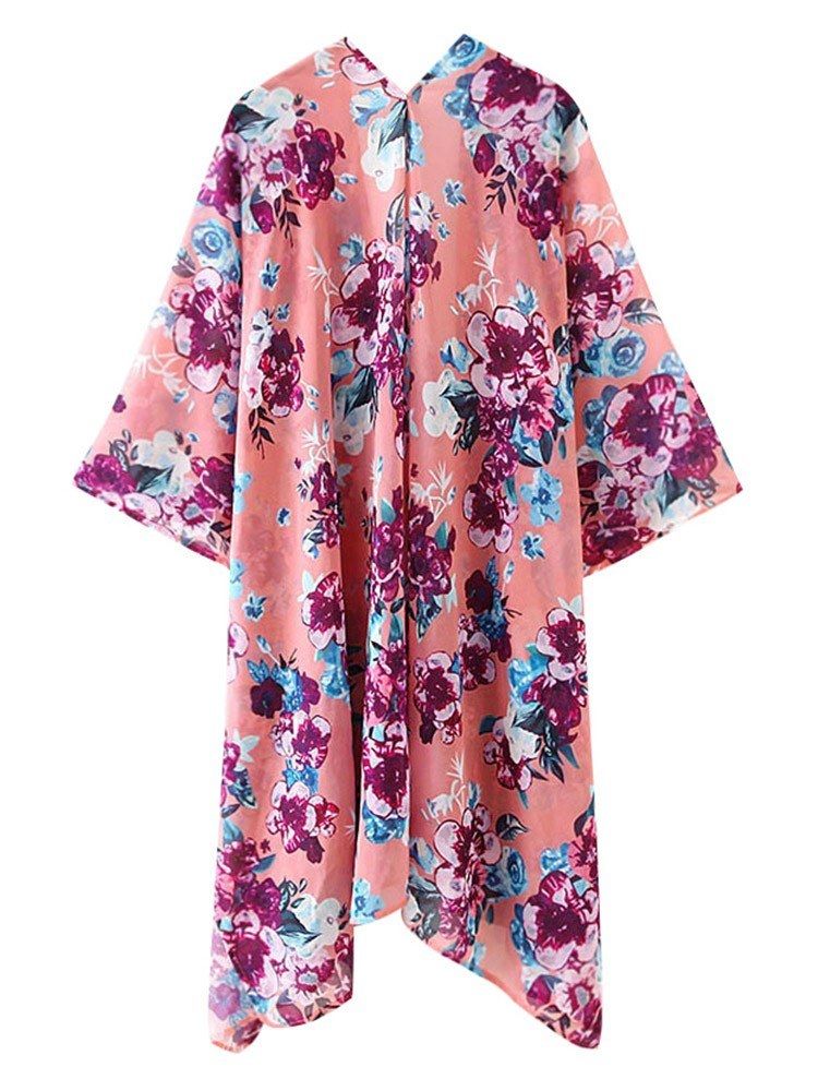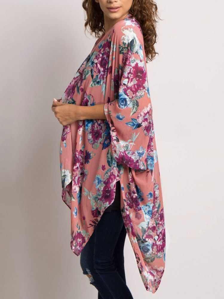 Floral print finish brings a vintage feeling. Open front, wide 3/4 sleeves, slit sides and asymmetrical hemline make it swinging in the summer breeze.