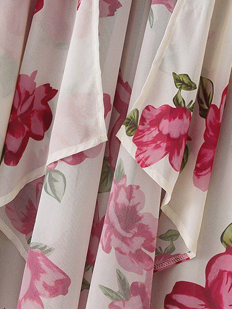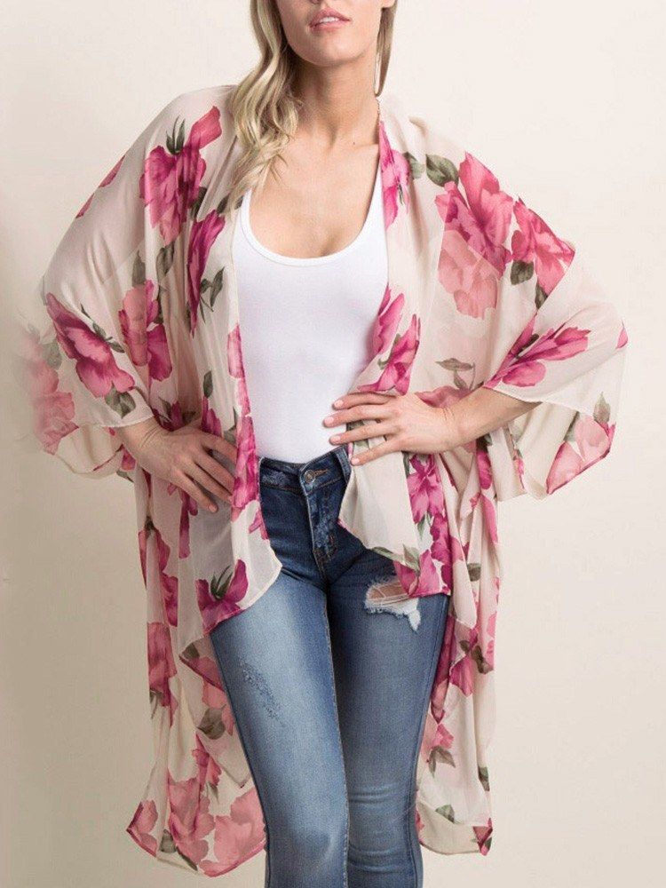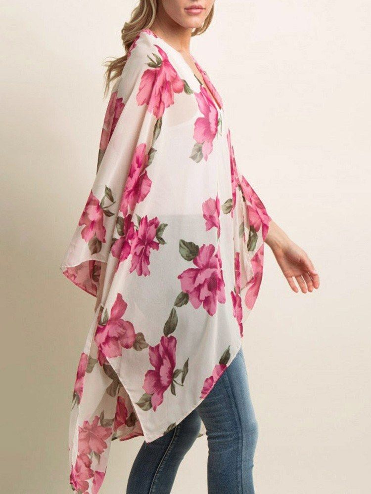 Floral print finish brings a refresh and vintage feeling. Open front, batwing 3/4 sleeves and asymmetrical hemline show nice draped detailing and make it swinging in the summer breeze.
