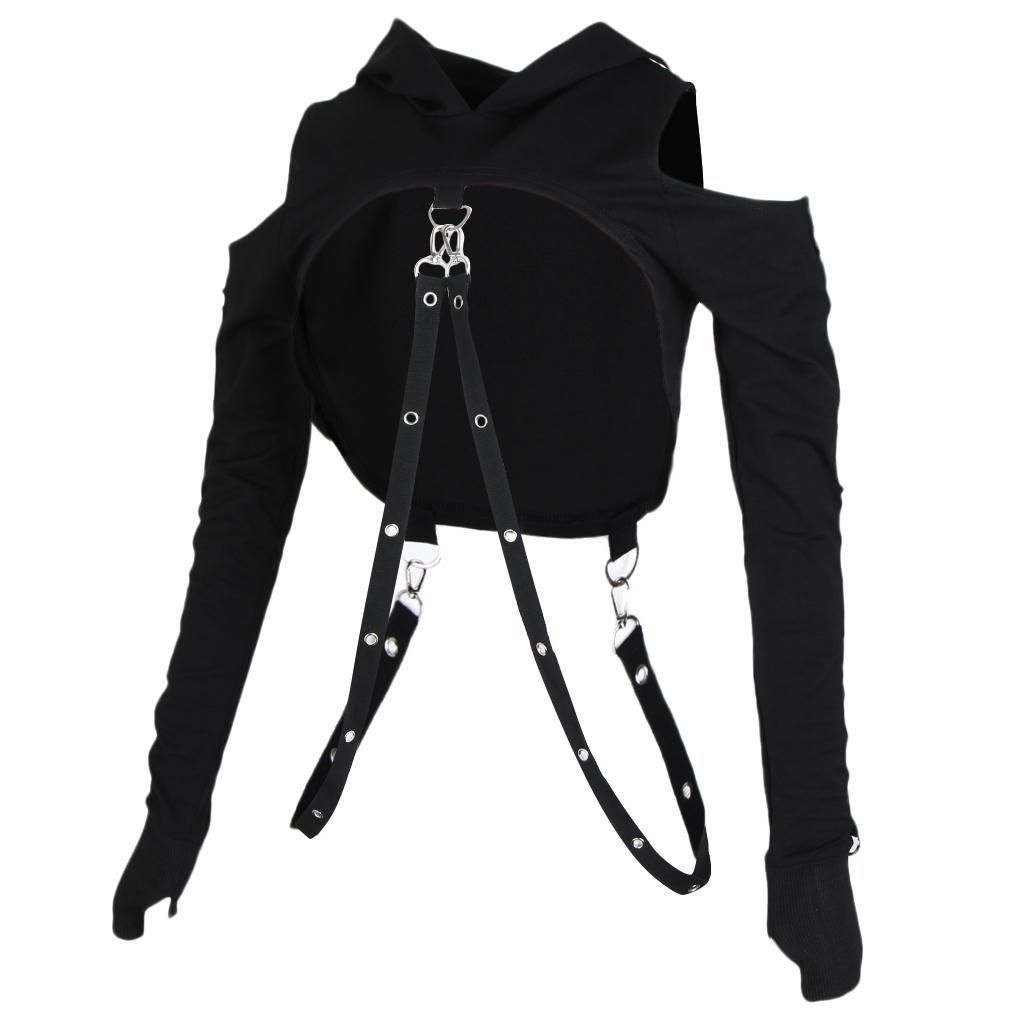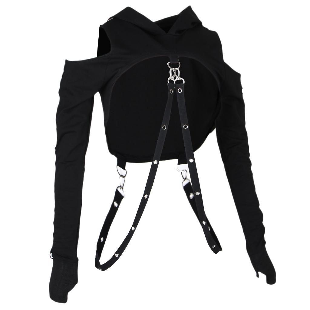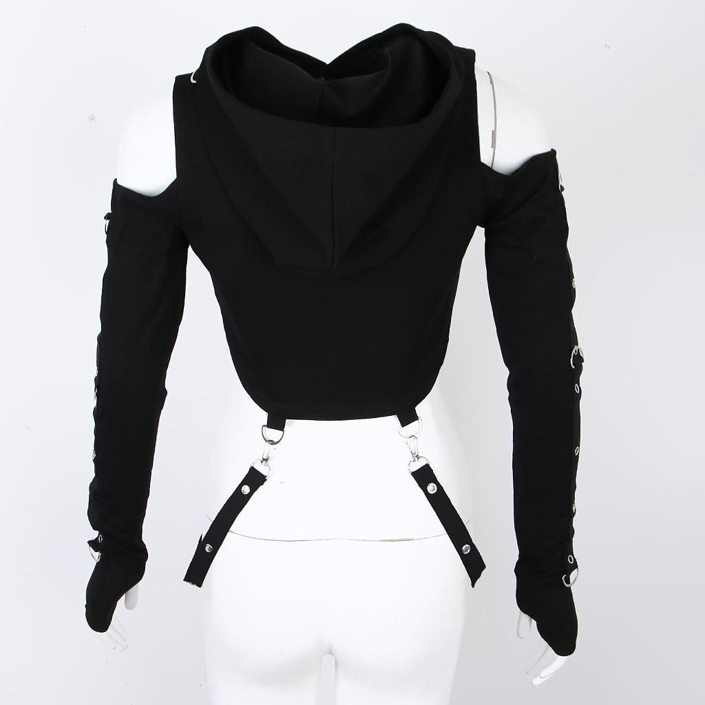 Style: Silver metal round buckle, long sleeve hoodies, crop top, street style, off shoulder, hole, fishnet, splicing, irregular, dark black.
