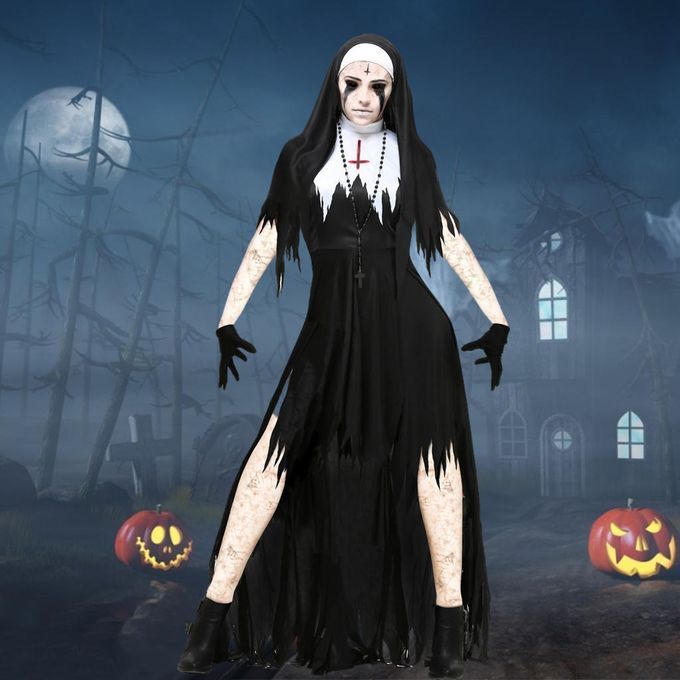 women nun costume;women nun costume halloween party Fanny dress;sorceress cosplay fancy dress costumes outfit;long sleeve nun dress with hat Necklace;halloween witch long skirt stage costume cosplay;scary themed party suit drama masquerade clothing