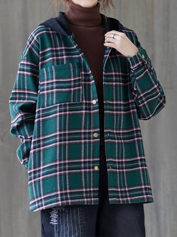 Buy Women Hoodie Literary Check Print Pocket Button Long Sleeve Vintage Coats in Nigeria