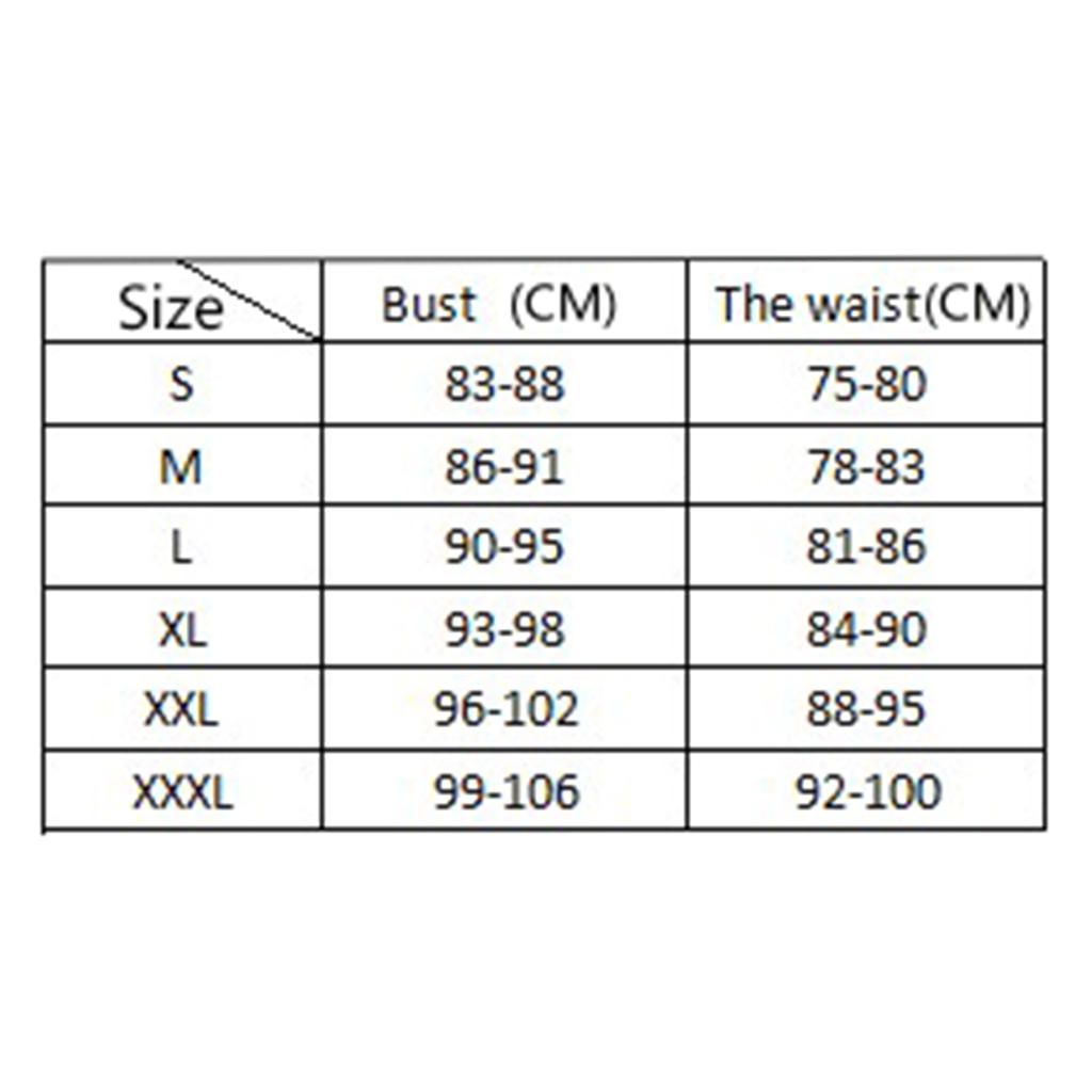 Size (All measurement in cm and please note 1cm=0.39inch)S Chest 82cm/32.3in, Waist 76cm/29.92in, Hip 90cm/35.43inM Chest 86cm/33.85in, Waist 80cm/31.5in, Hip 94cm/37inL Chest 90cm/35.43in, Waist 84cm/33.07in, Hip 98cm/38.58inXL Chest 94cm/37in, Waist 88cm/34.65in, Hip 102cm/40.16inXXL Chest 98cm/38.58in, Waist 92cm/36.22in, Hip 106cm/41.73in