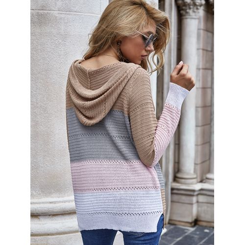 Buy Women Long Sleeve Contrasting Color Loose Hollow Knit Hooded Sweater-Pink in Nigeria