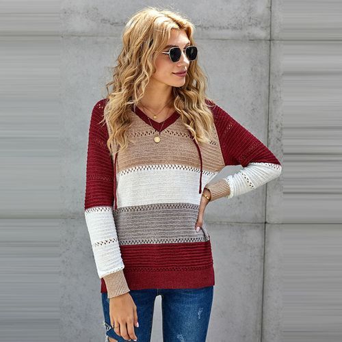 Buy Women Long Sleeve Contrasting Color Loose Hollow Knit Hooded Sweater-Red in Nigeria