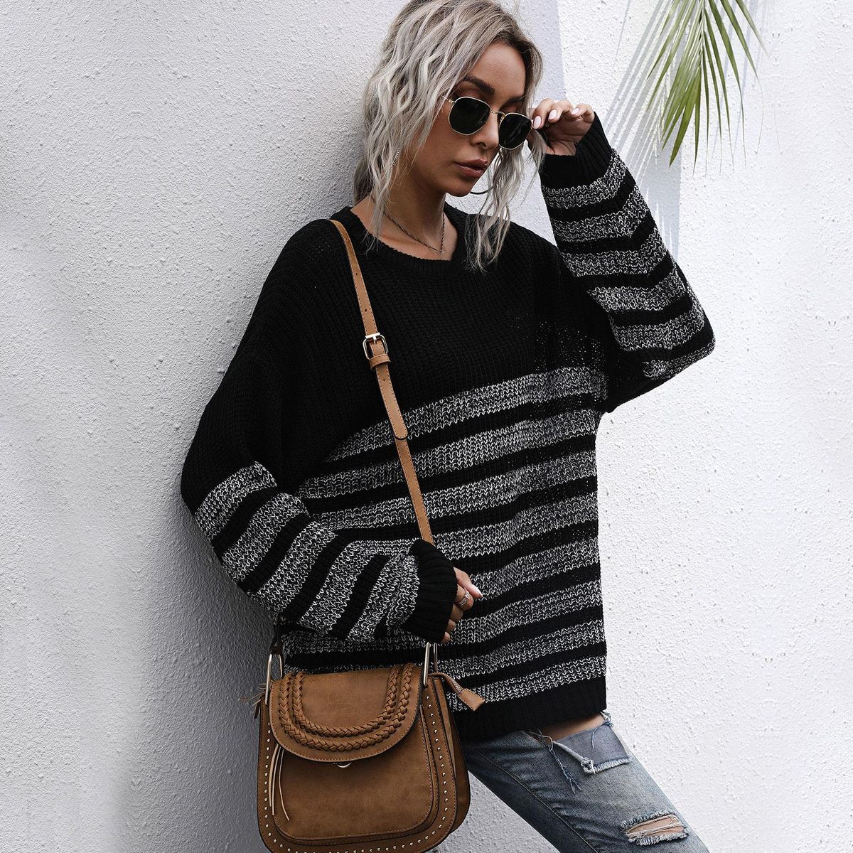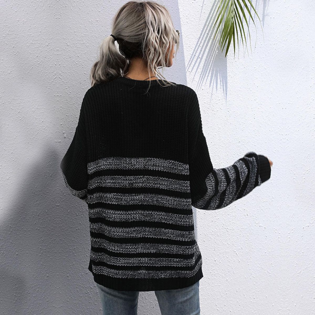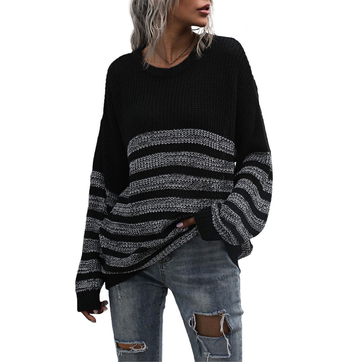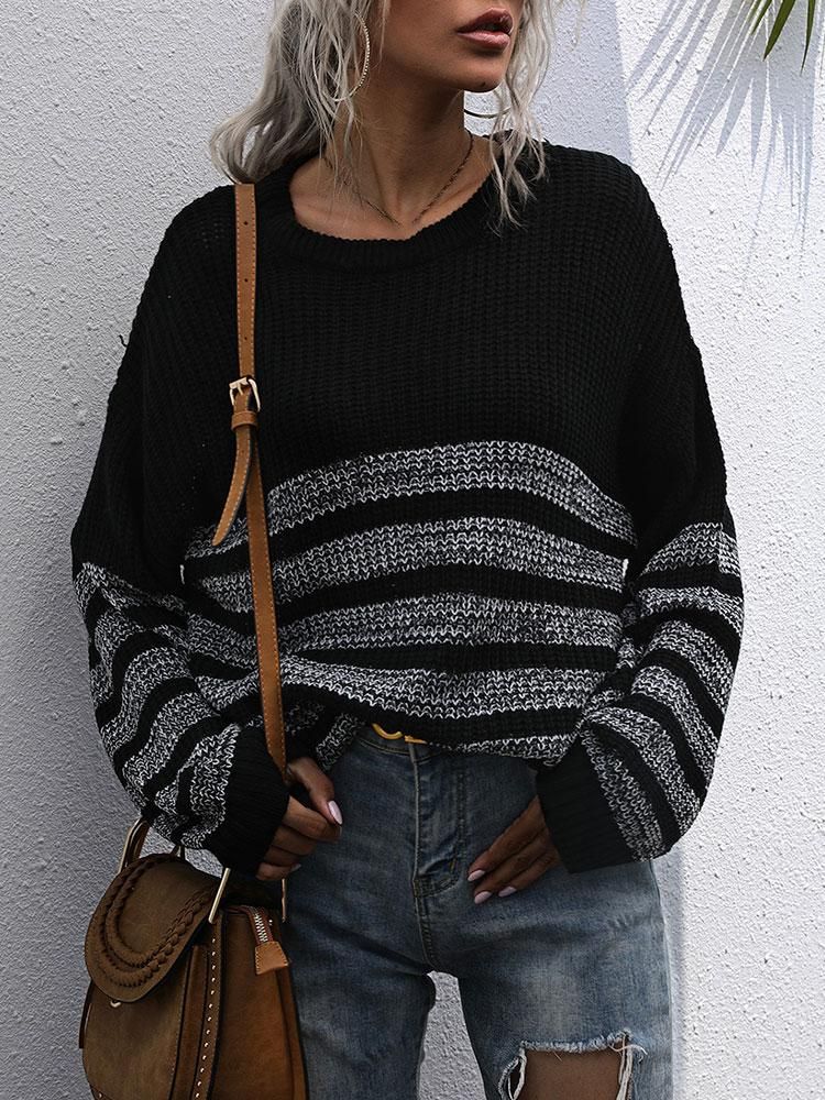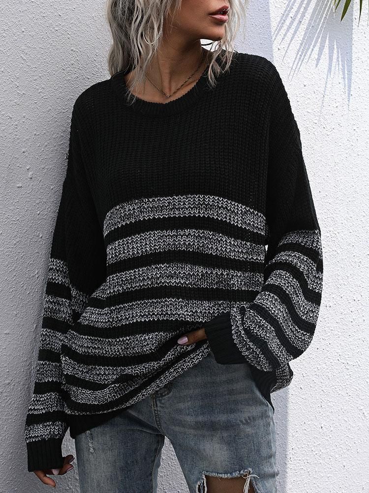 Buy Women Loose Knitted Sweater Stripped Splicing Long Sleeve Mid-Length Pullover Tunics Casual Sweatshirt in Nigeria