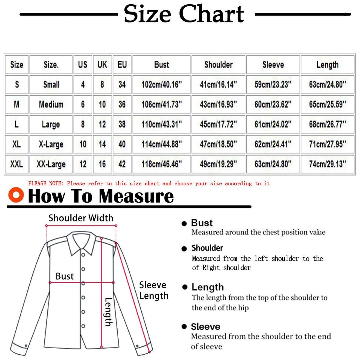 Size: XXL Size.: XX-Large US: 12 UK: 16 EU: 42 Bust: 120cm/47.24'' Shoulder: 49cm/19.29'' Sleeve: 63cm/24.80'' Length: 77cm/30.31''