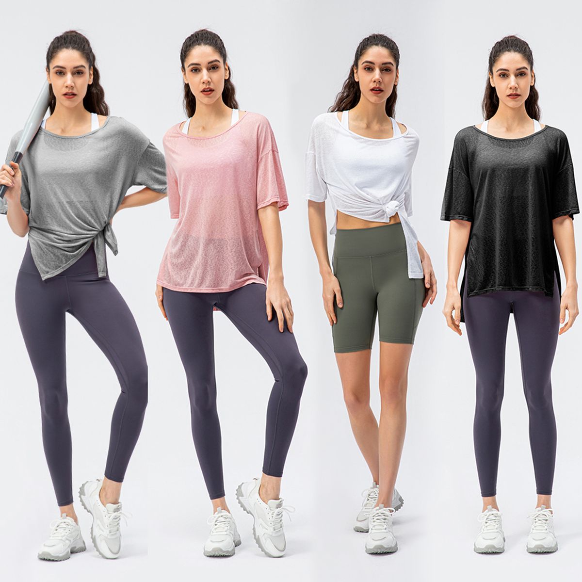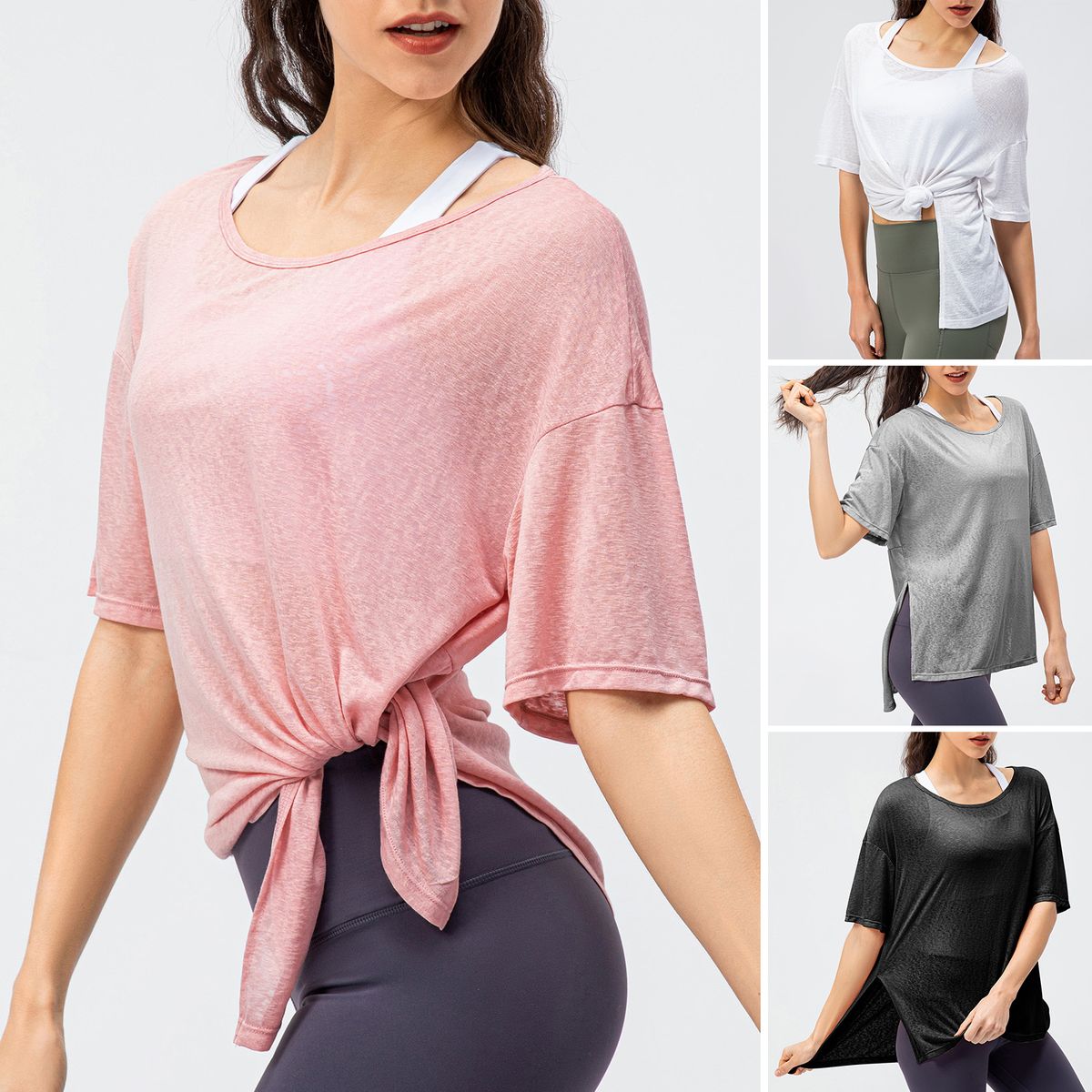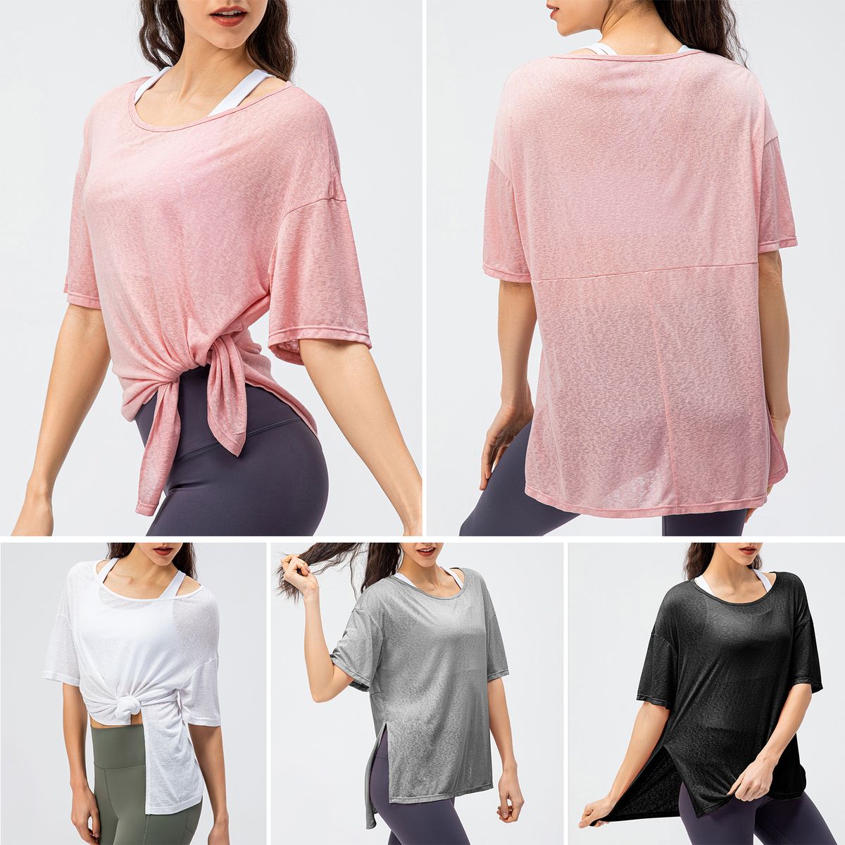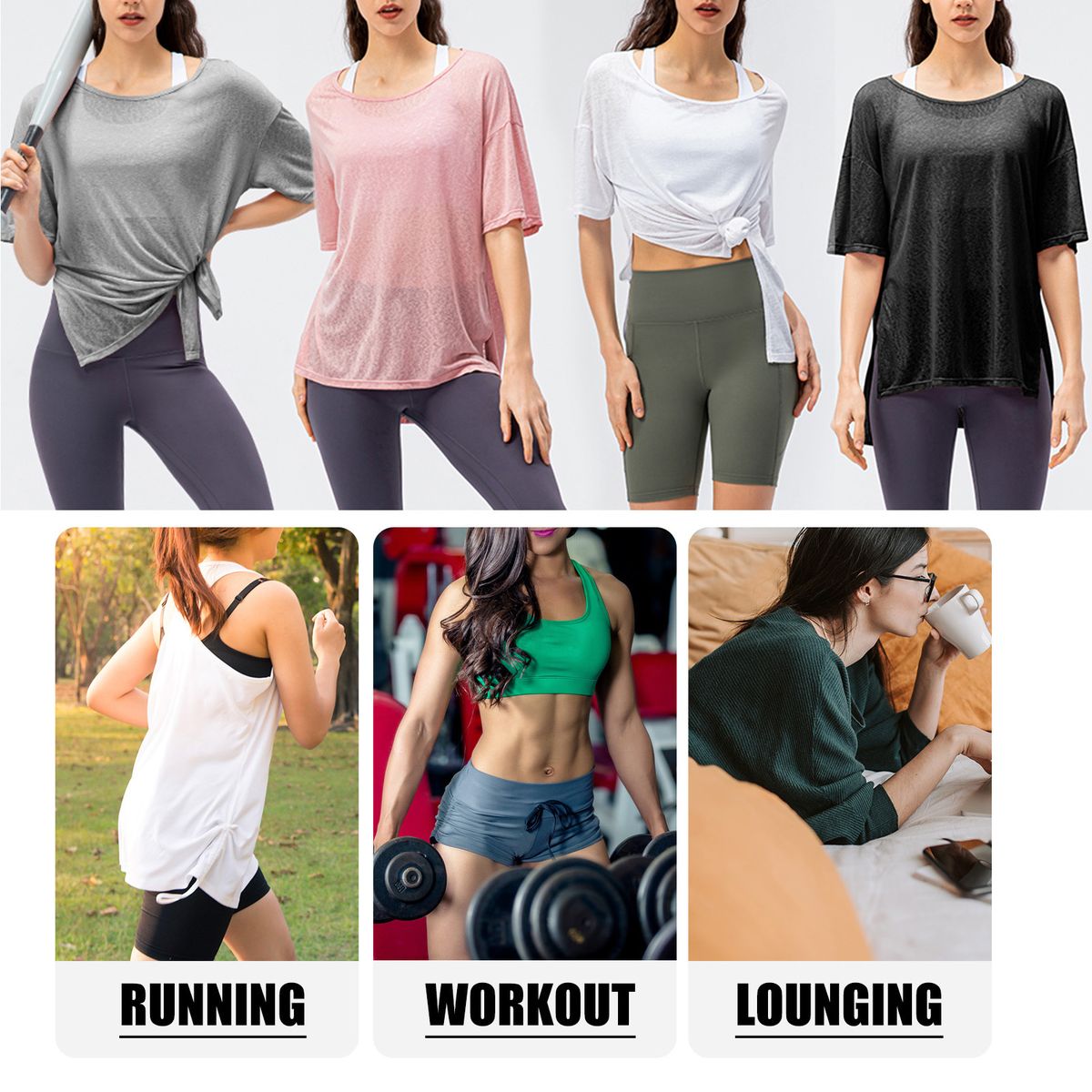 Loose Silhouette: Loose cut with round neck, dropped shoulder and half sleeves to pair sports bra and pants.