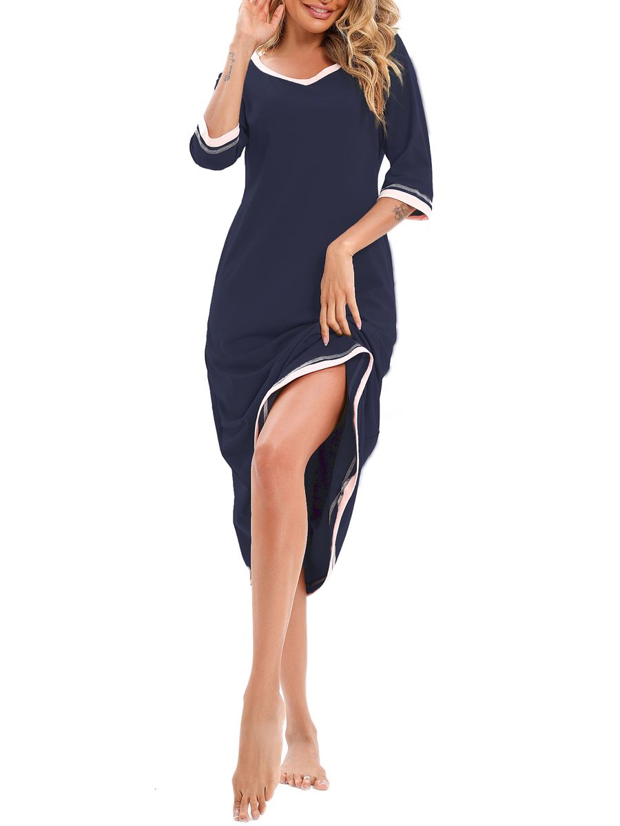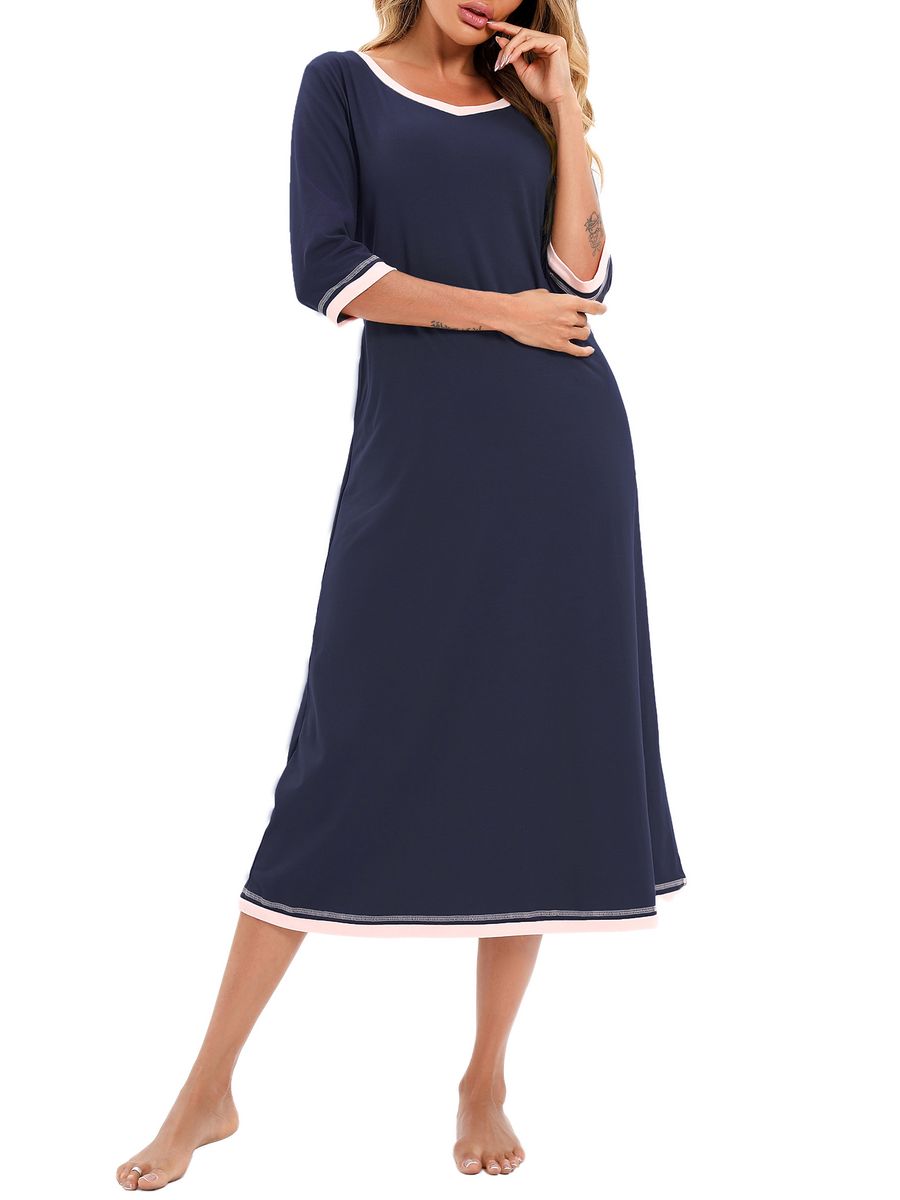 Loose silhouette with V neck, three-quarter sleeves and white trims.
