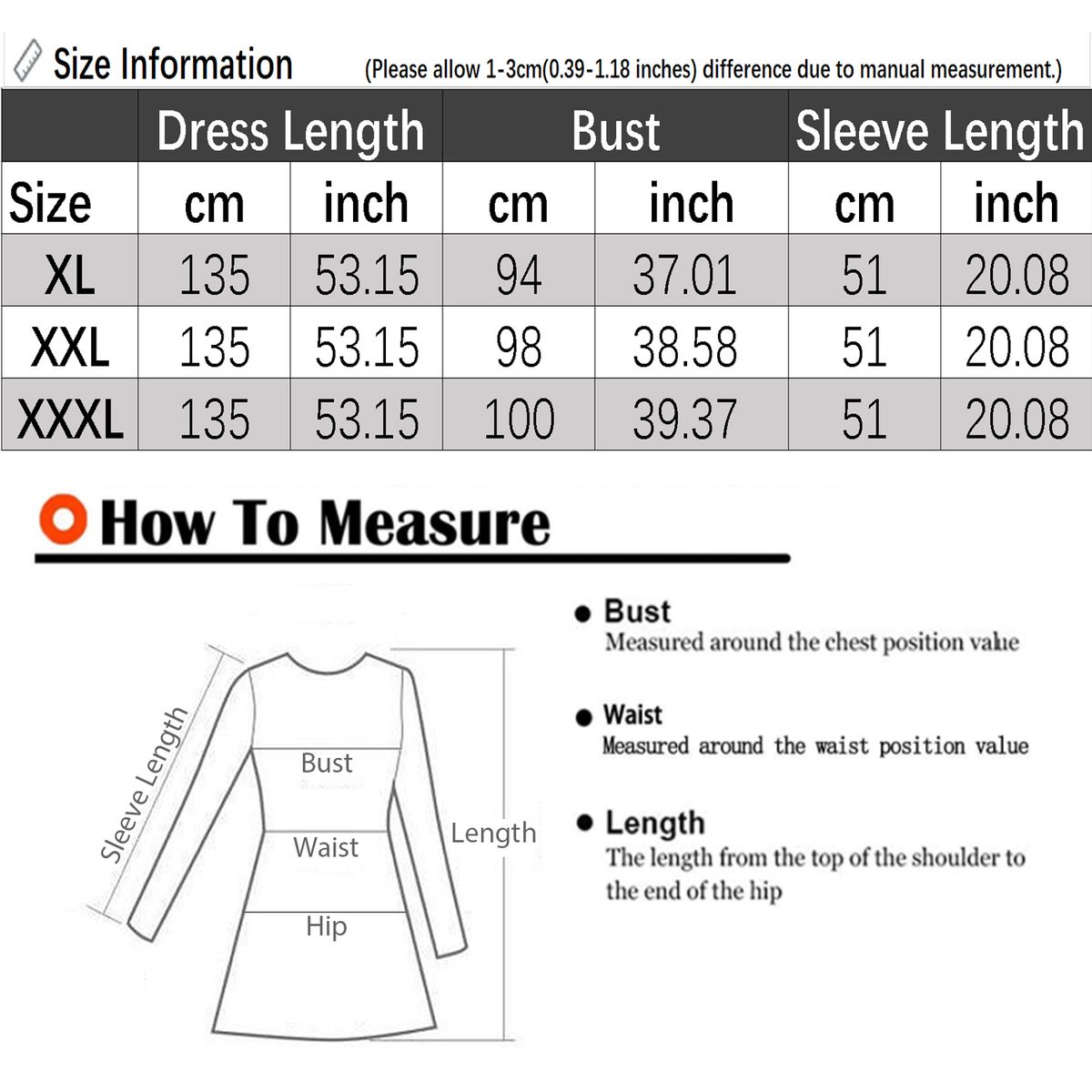 Note:1. Please understand colors may differ due to different devices and display effects.2. Please allow a 1-3cm(0.39-1.18 inches) difference due to manual measurement.3. Double check the size chart carefully before placing the order (if you have difficulty choosing the size, please contact us).