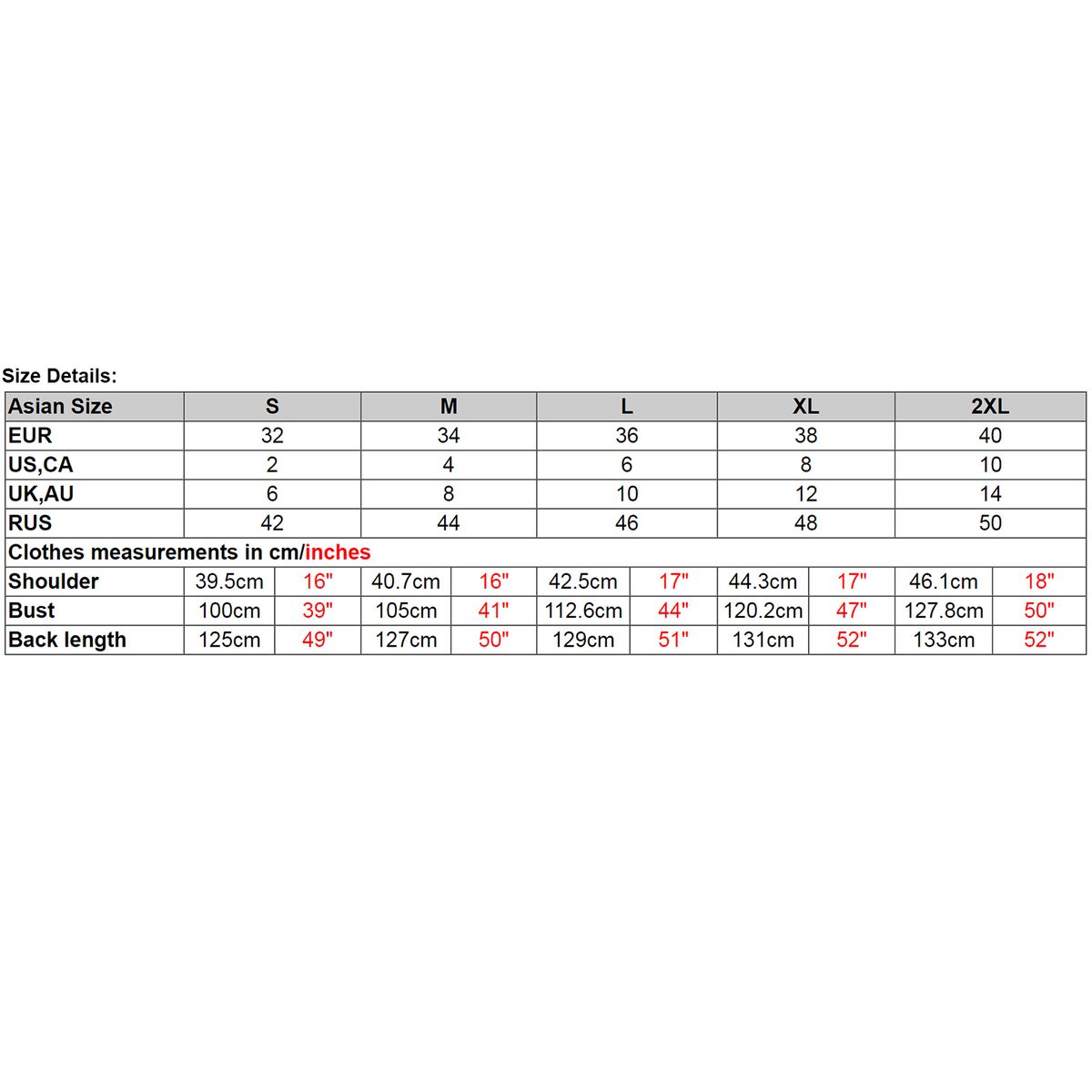 1. This clothing size information is just for reference only, please check the above detailed measurement to choose the correct size, and allow 1-2cm (0.4-0.8 quot;) differences due to manual measurement, thanks.