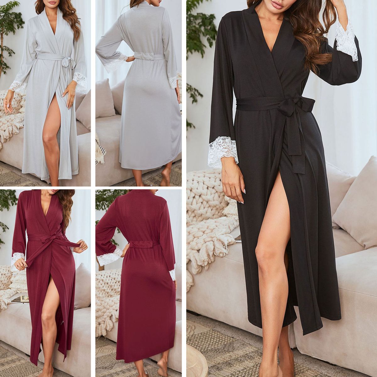 Made of fine fabric, this robe is very soft and comfortable to wear. Featuring a v neck, a sash, lace trim at the sleeves, and full length, this robe makes you elegant and fashionable. Just have it for a lovely night.