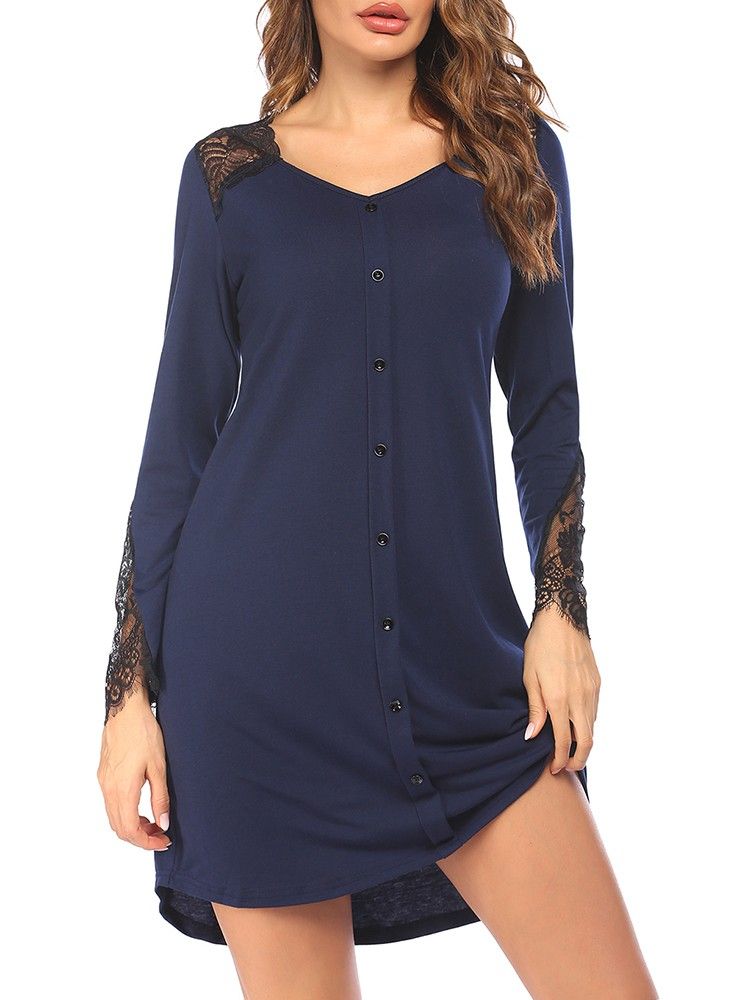 This nightdress is made of soft fabric. Cut with loose fit, it features lace splicing, front buttons, V-neck, long sleeve and above-knee length. Fits for lounging, pajama party, home, and other occasions.