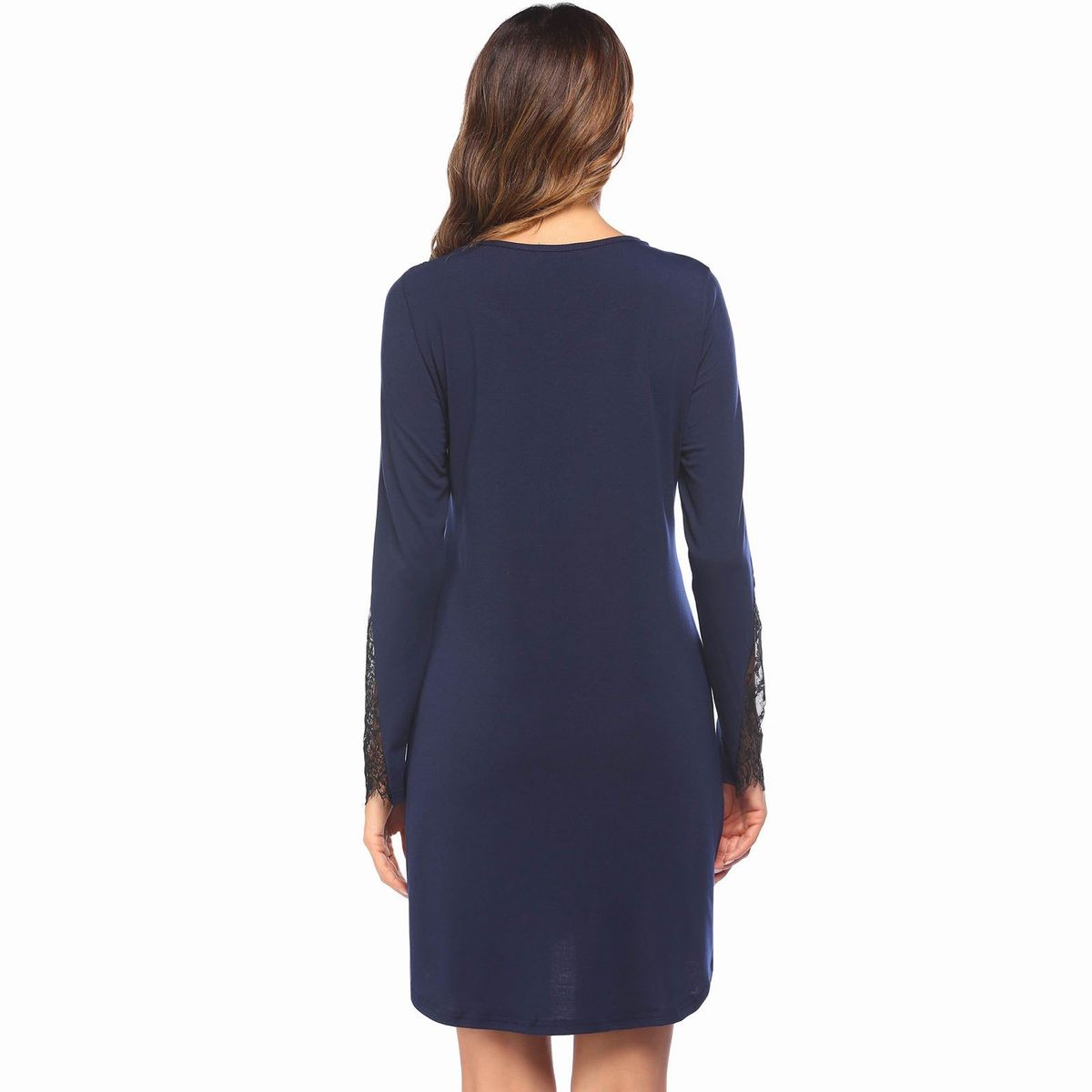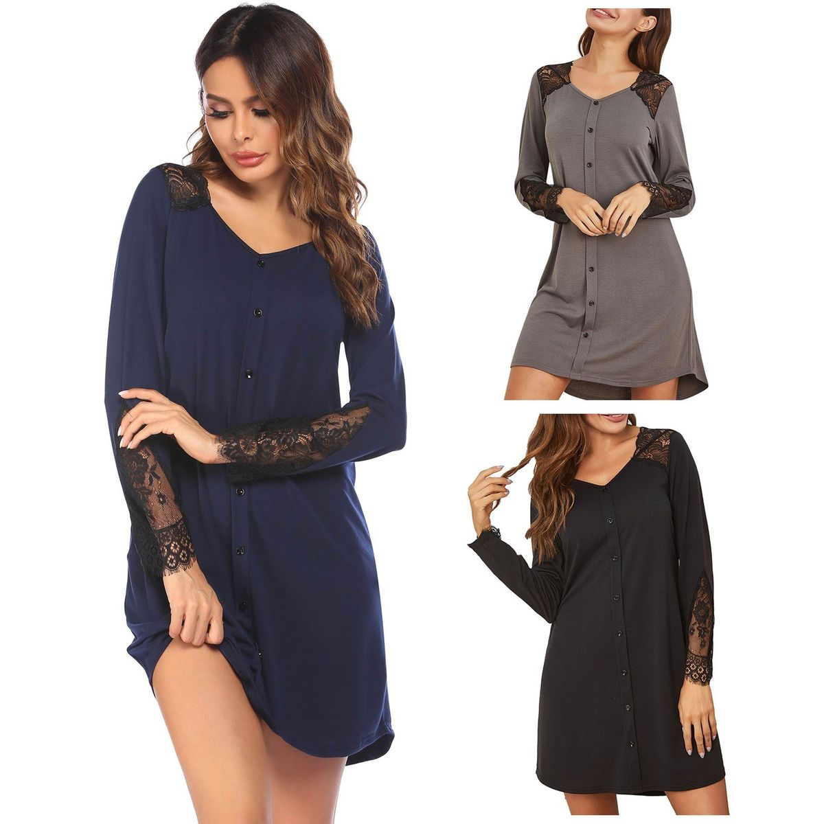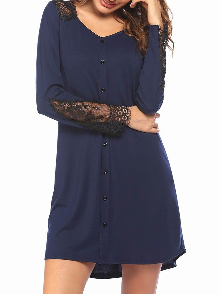 This nightdress is made of soft fabric. Cut with loose fit, it features lace splicing, front buttons, V-neck, long sleeve and above-knee length. Fits for lounging, pajama party, home, and other occasions.