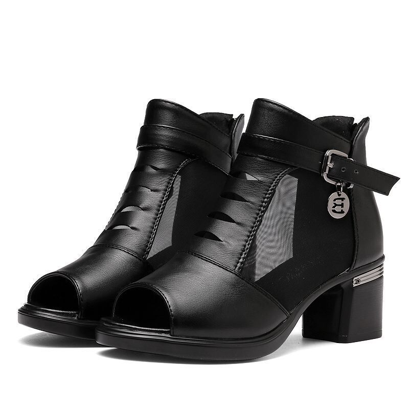 1X Women Peep Toe Sandals Boots Women PU Leather Summer Mesh Shoes Low Heels Back Zip BLACK Dropshipping