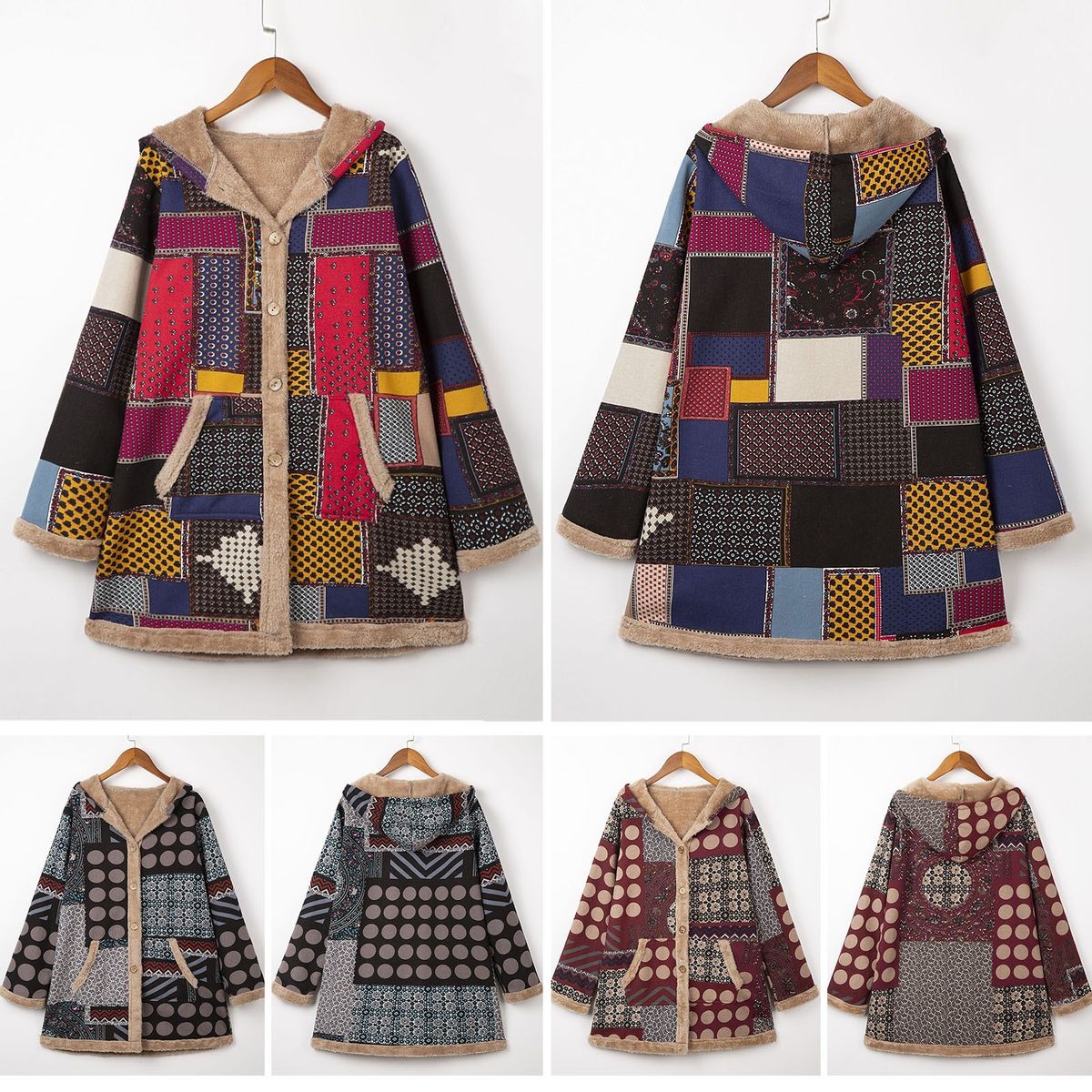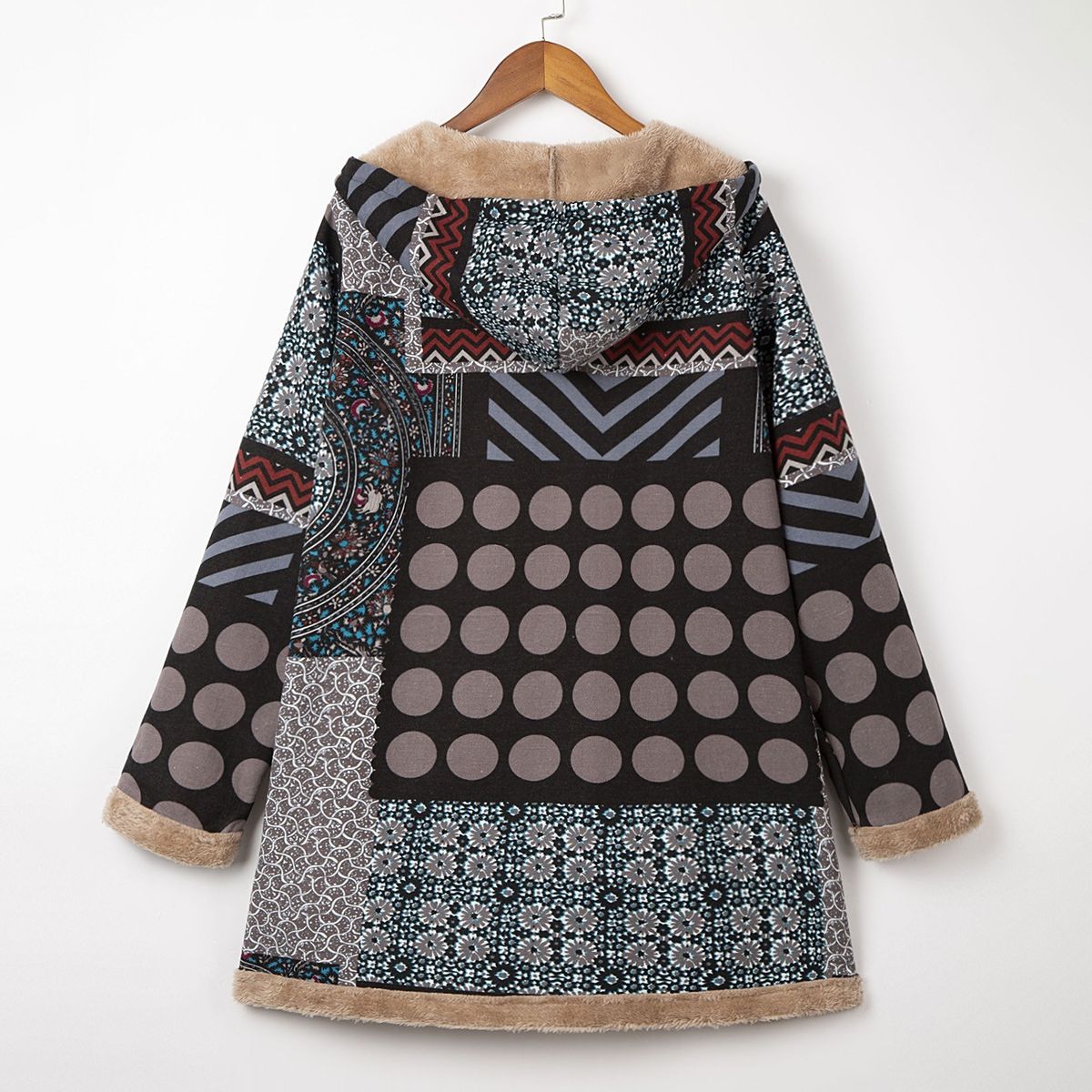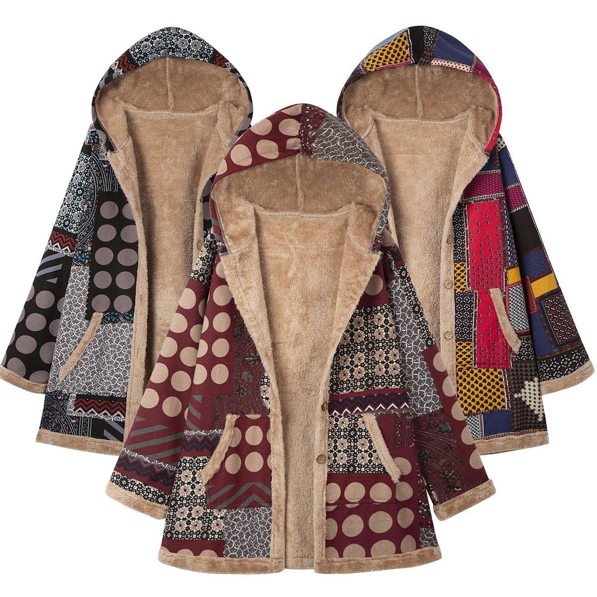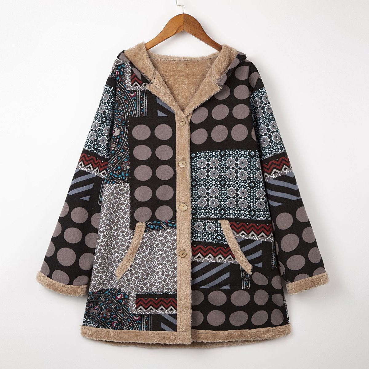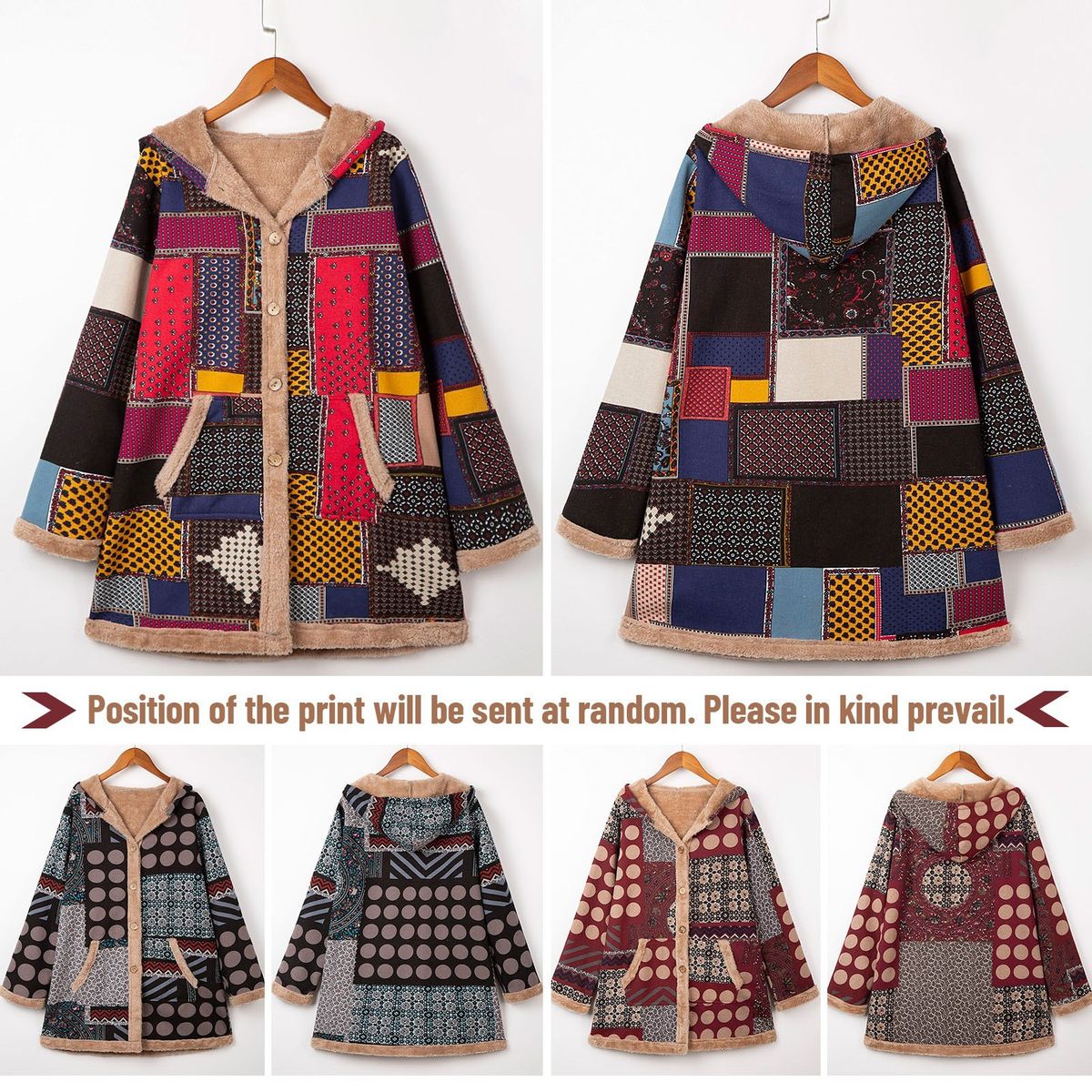 Loose vintage printed coat for the coming winter. It has hooded neck, buttons closure at front, side pockets and long sleeves. The furry fleece liner at hood, body and sleeve keeps you warm. Have it to pair jeans and boots to complete the retro style.