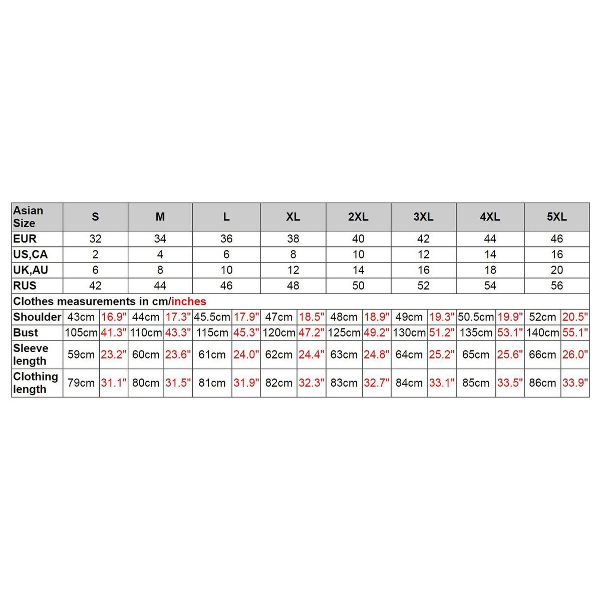 Size: S (US2 UK/AU6 EU32) / M (US4 UK/AU8 EU34) / L (US6 UK/AU10 EU36) / XL (US8 UK/AU12 EU38) / 2XL (US10 UK/AU14 EU40) / 3XL (US12 UK/AU16 EU42) / 4XL (US14 UK/AU18 EU44) / 5XL (US16 UK/AU20 EU46) (optional)