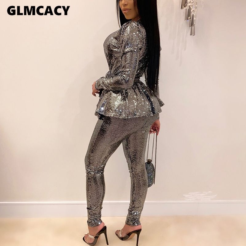 1X Women Plus Size Office Ladies Sequined Autumn 2 Two Piece Set Top and Pants Elegant Female Casual Business Suits