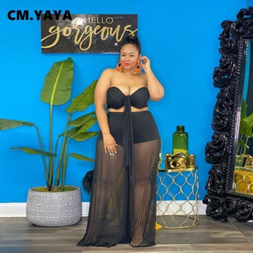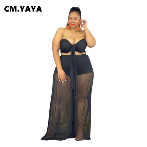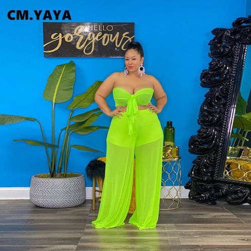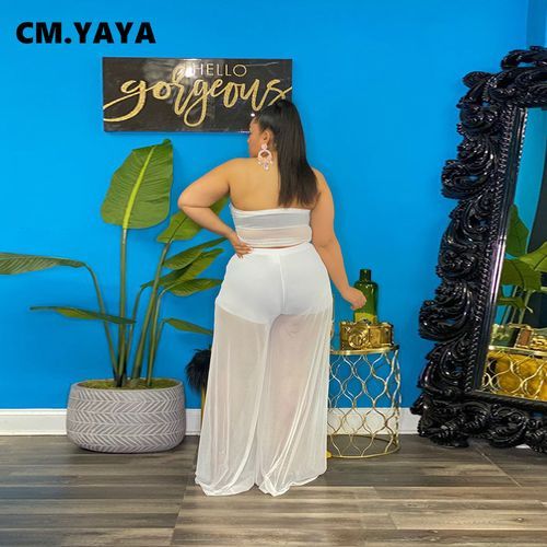 1X CM.YAYA Women Plus Size Set Solid Mesh Sleeveless Sless Crop Tops Wide Leg Pants Two 2 Piece Sets y Fashion Outfit Summer