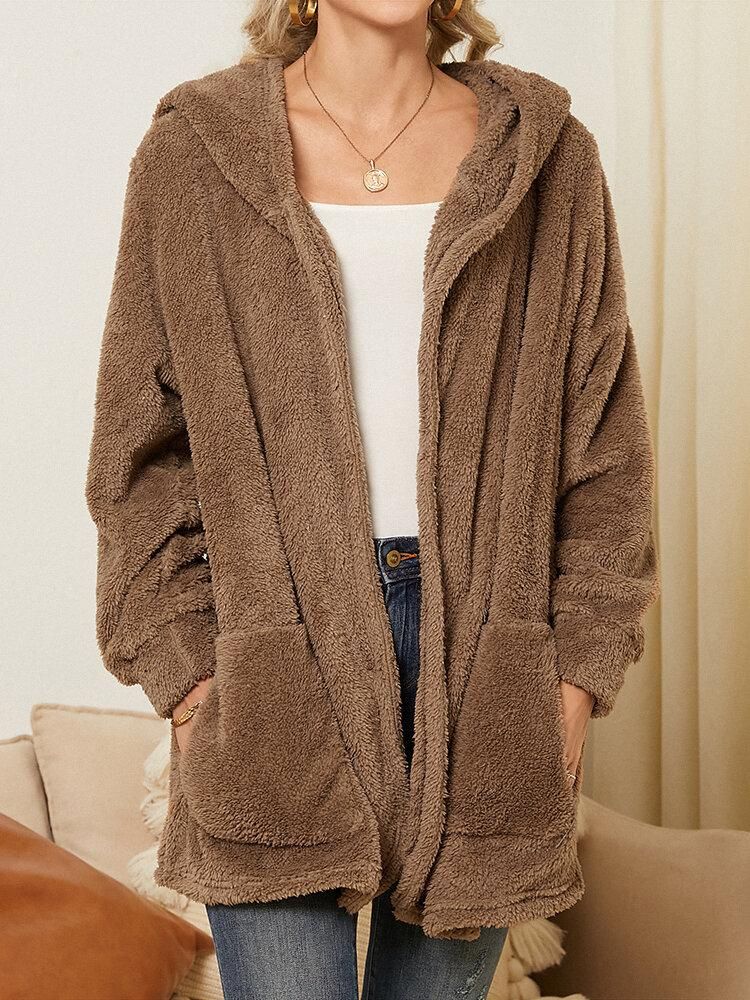 Buy Women Plush Coat Open Front Side Pockets Casual Hooded Sweatshirt in Nigeria